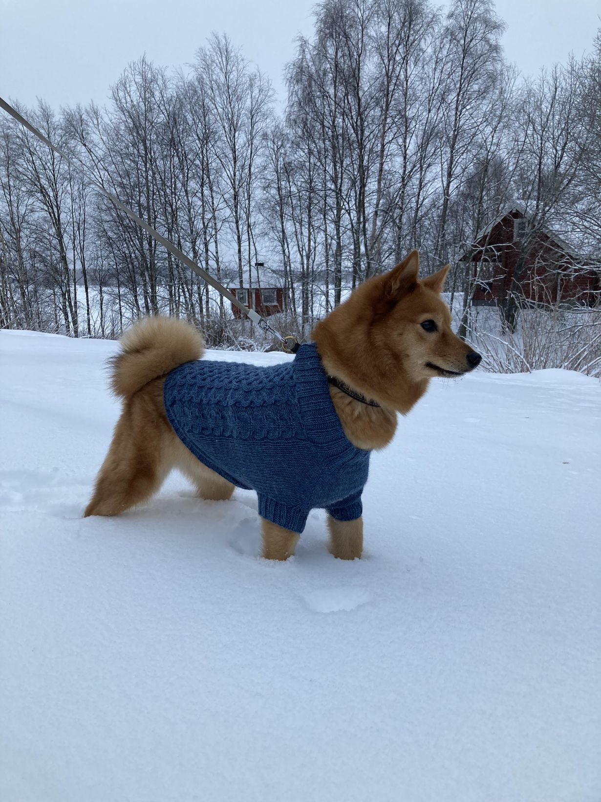 Suomenpystykorva Nipsu alkoi pudottaa karvaansa juuri ennen Lapin kovia pakkasia. Siskon neuloma sininen villapaita lämmittää lenkeillä.