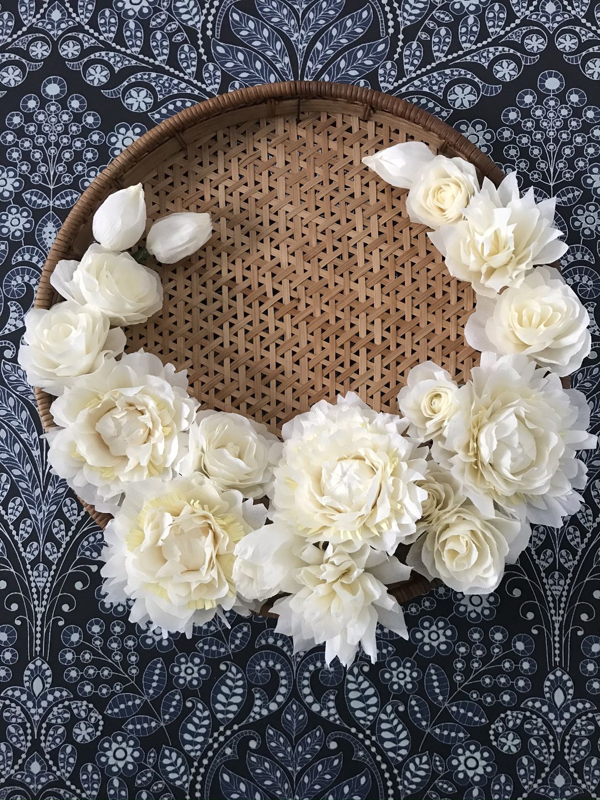 Kreppipaperkukkaset valtasivat 70-luvun Indiskan tarjottimen, Tukholmasta ostetun. Ensin kukkivat tulppaanit, kun aidot pudottivat terälehtensä sabluunaksi. Pionit syntyivät leikkurin terän mallien mukaan. Sitä minulla ei ollut, mutta noin 80 yksittäistä, erilaista ja erikseen leikattua terälehteä on! Ruusuja luulin tekeväni ’tuosta vaan’, vaati harjoittelua sekin. Mukaan mahtui myös muutama muka-kukkanen.