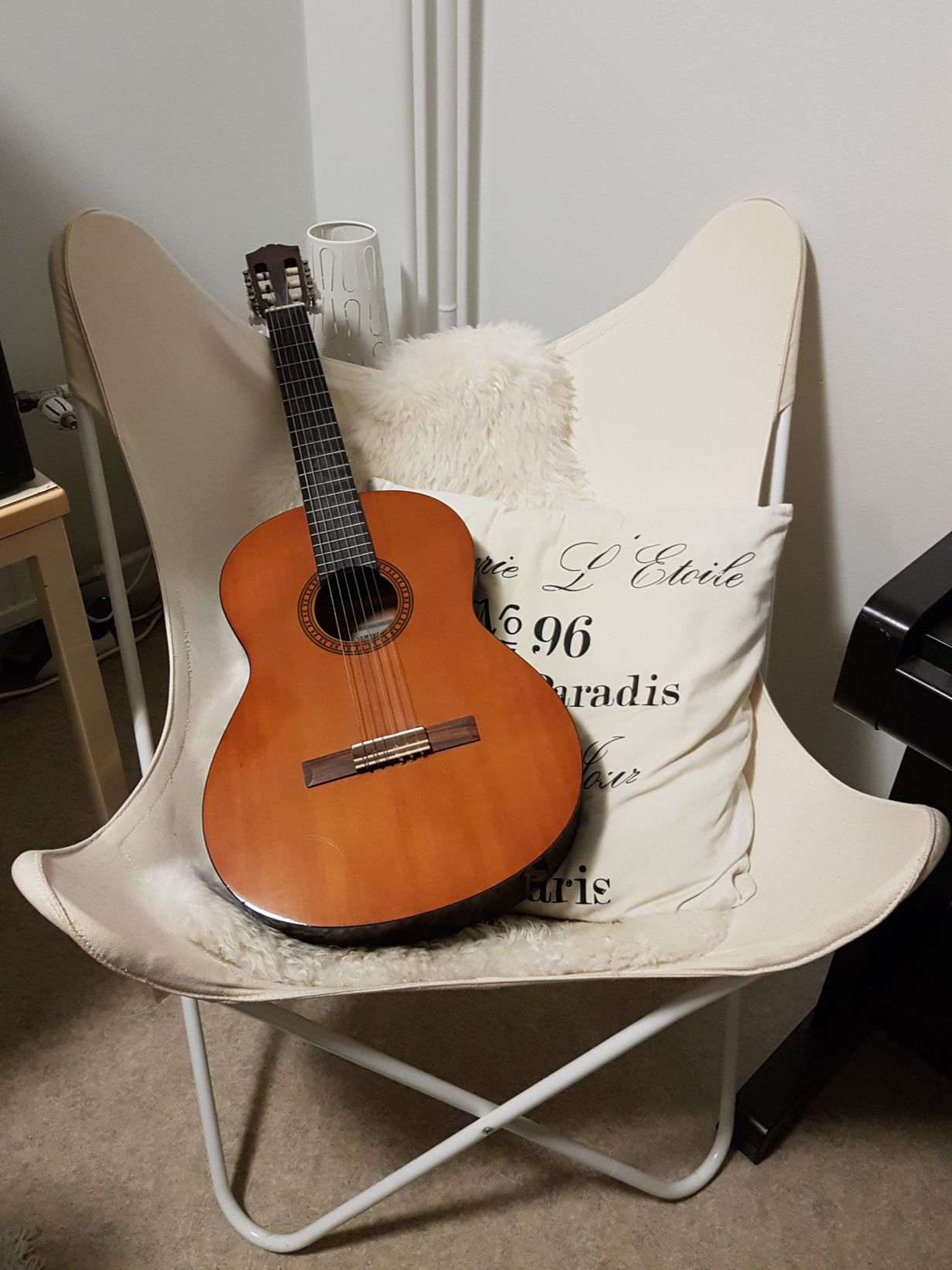 Pienen kaksion ainoana nojatuolina toimii lapsuuden kodista kuljettamani lepakkotuoli. Tuoli on ahtaassa paikassa eikä siinä juurikaan istuta, se toimii lähinnä kitaran tai vaatteiden säilytyspaikkana.