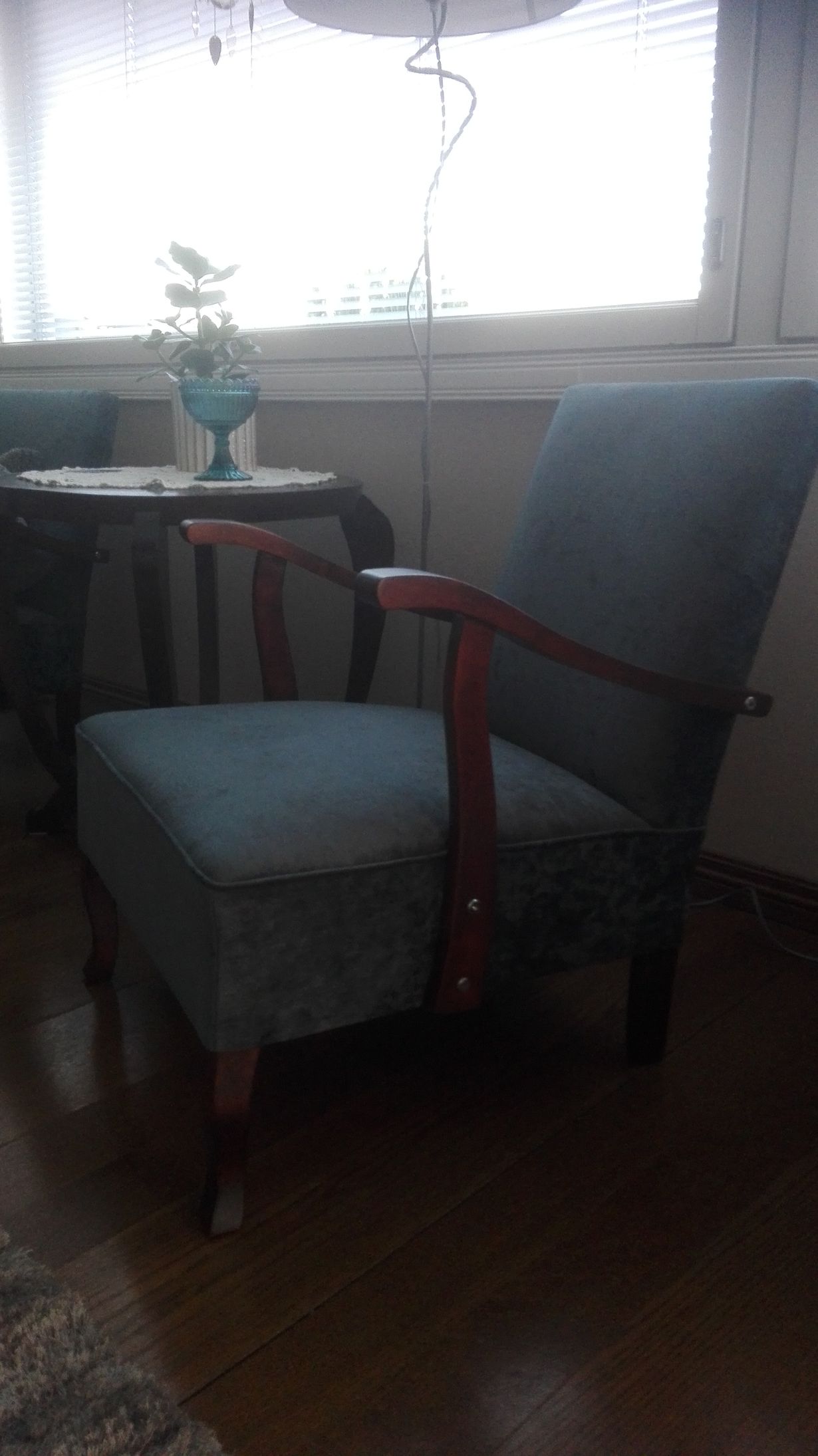 Vuoden 2012 alussa mieheni sai syöpädiagnoosin, huolimatta siitä hänellä riitti uskoa tulevaisuuteen. Asuimme rintamiestalossa, jossa alakerrassa oli sauna ja pesutilat, sekä musiikkihuone, jossa kuuntelimme äänilevyjä saunomisen jälkeen. Eräänä iltana mieheni sanoi, että pitäisi löytää pienet nojatuolit, jossa olisi kiva istuskella. Kävimme kirppareilla jen, mutta sopivia ei löytynyt, mutta sitten menimme mieheni äidin luokse äitienpäiän aikoihin ja muistin, että siellä oli pienet nojatuolit saunakamarissa. Niinpä rohkeasti kysymään, saisimmeko ne tuolit ja se onnistui. Mieheni osti kuvassa olevan tuolin kankaan ja hänen oli tarkoitus verhoilla ja kunnostaa liki 80 vuotiaat tuolit, mutta kuolema tulikin odotettua aiemmin. Minä osallistuin Työväenopiston verhoilukurssille, mutta en saanut edes ensimmäistä tuolia valmiiksi kevääseen mennssä. Onneksi sain ne verhoiltavaksi kaupungin verhoilupaikkaan, ja tulos näkyy. Ensin vierastin tuon kankaan väriä, mutta nyt se on yksi tärkeimmistä väreistä, joita yritän ottaa huomioon kodin sisustamiesta. Muutin kerrostaloon n 5 vuotta mieheni kuoleman jälkeen, joten saan pitää muistot näiltäkin osin mukanani.