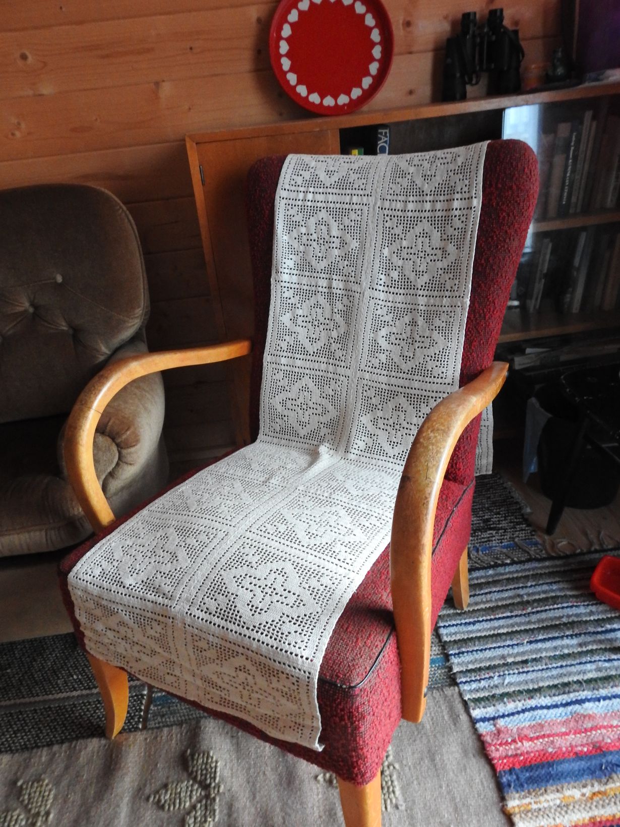 Tämä tuoli siirtyi huoneeseeni mummun puolelta ollessani kouluikäinen. Mennessäni naimisiin tuoli siirtyi mukanamme aina kaikkiaan yhteentoista kotiin. Erityisen hyvä tuoli oli imettäessä. Nyt tuoli on meidän mökillä ja vaikka "sisukset" vähän tippuilevat toimii edellen hyvin tehtävässään nojatuolina.