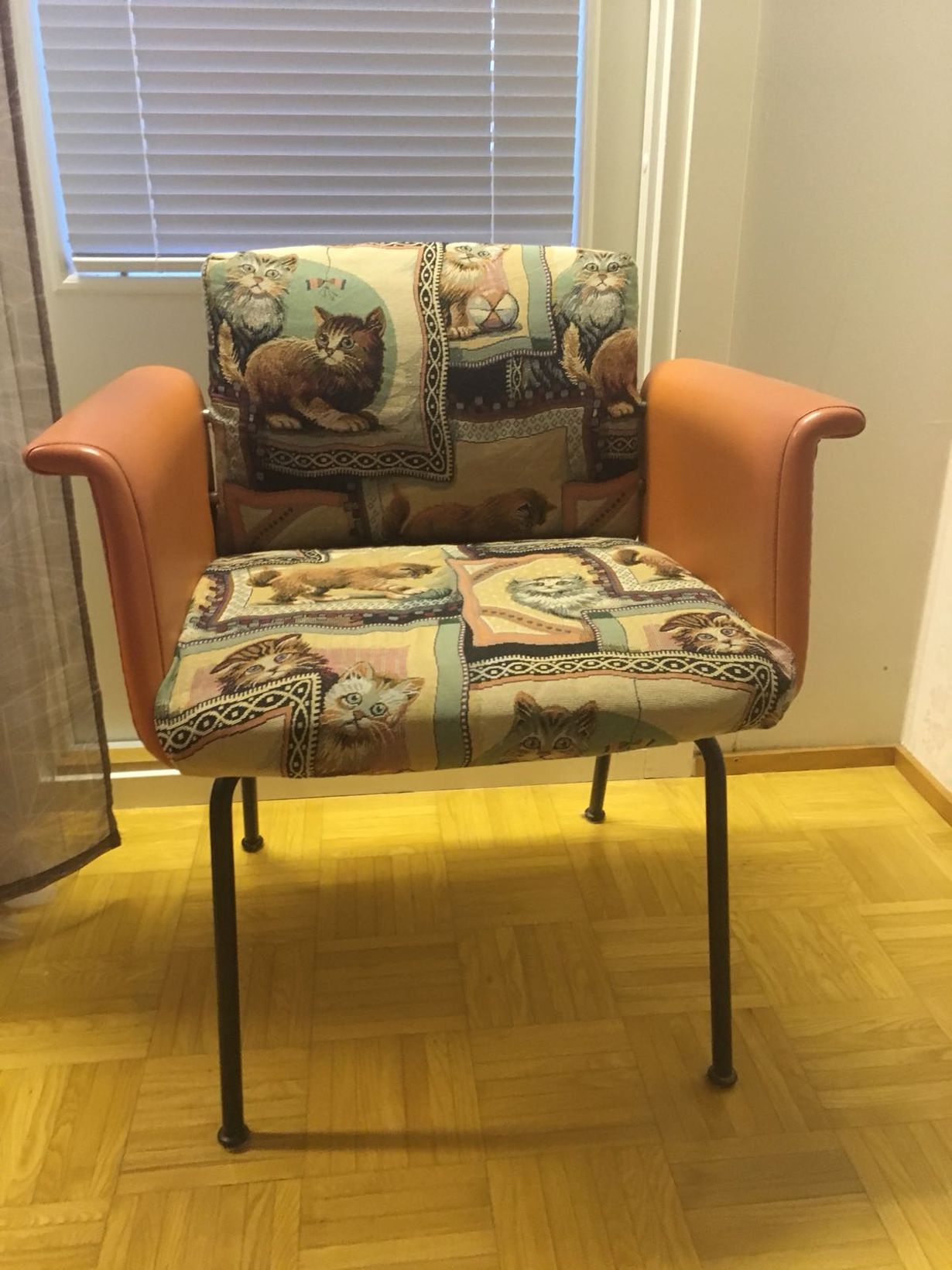 Sain tuolin siskoltani. Hän menetti työpaikkansa toimistossa 90-luvun lamassa. Toimisto tyhjennettiin ja kalusteita sai ottaa. Päällystin tuolin kissakankaalla lastenhuoneeseen. Nyt tuoli on tyttäreni opiskelukämpässä.