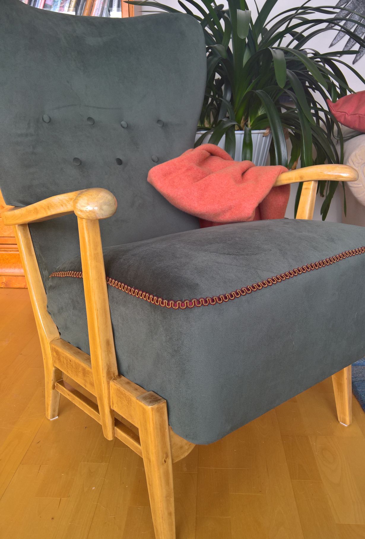 Yhden nojatuolin verhoiltuani vannoin ettei ikinä enää. Kunnes sisko ilmoitti, että upea mutta kulahtanut sukukalleusklassikko saa lähteä. Ei auttanut kun toistaa vuoden urakka. Nojatuoli pääsi juuri kurssiverstaalta kotiin.
