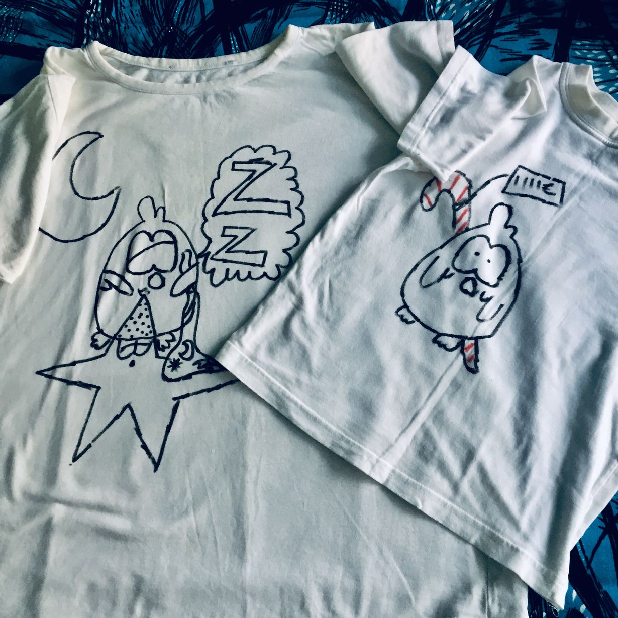 Tytär teki minulle ja itselleen nämä paidat jo parikymmentä vuotta sitten. Vuosittaisen vaatekaapin siivouksen yhteydessä mietin että joko nämä laittaisi pois... ei voi. Ei vaan voi. Oheen liittyi myös Huut-pöllön seikkailut sarjakuvana.