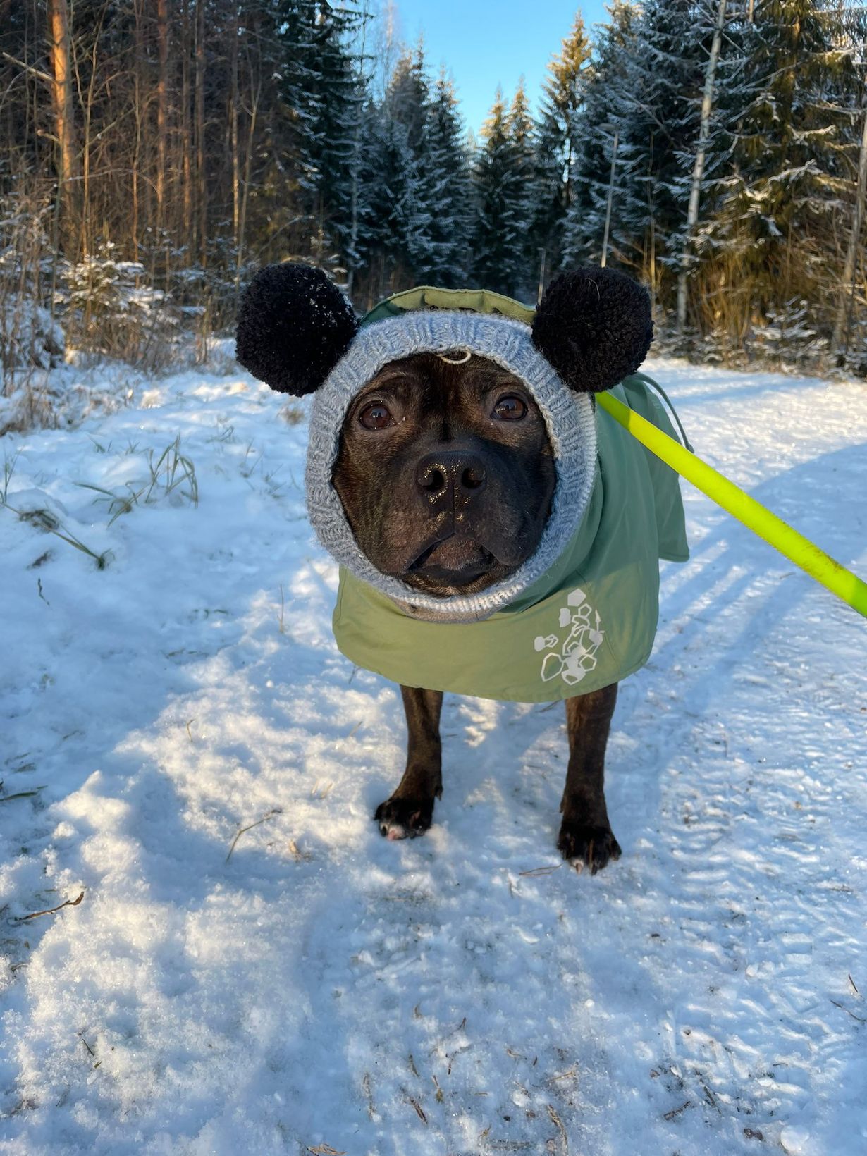 Kaksi vuotta sitten silloin 18 -vuotias tyttäreni oli ulkoilemassa, kun hän sattumalta tapasi staffi -rotuista koiraa ulkoiluttaneen naisen. Osoittautui, että nainen oli kasvattaja, jolla oli pian pentue tulossa. Tyttäreni pääsi mukaan koiraemon odotusvaiheeseen, synnytykseen ja pentujen kasvuun (tämä on harvinaista). Pennuista tyttäreni valitsi itselleen tämän Domin, josta hän sai ihan tolkun koiran, vaikka tässä poseeraakin pellepuvussa.