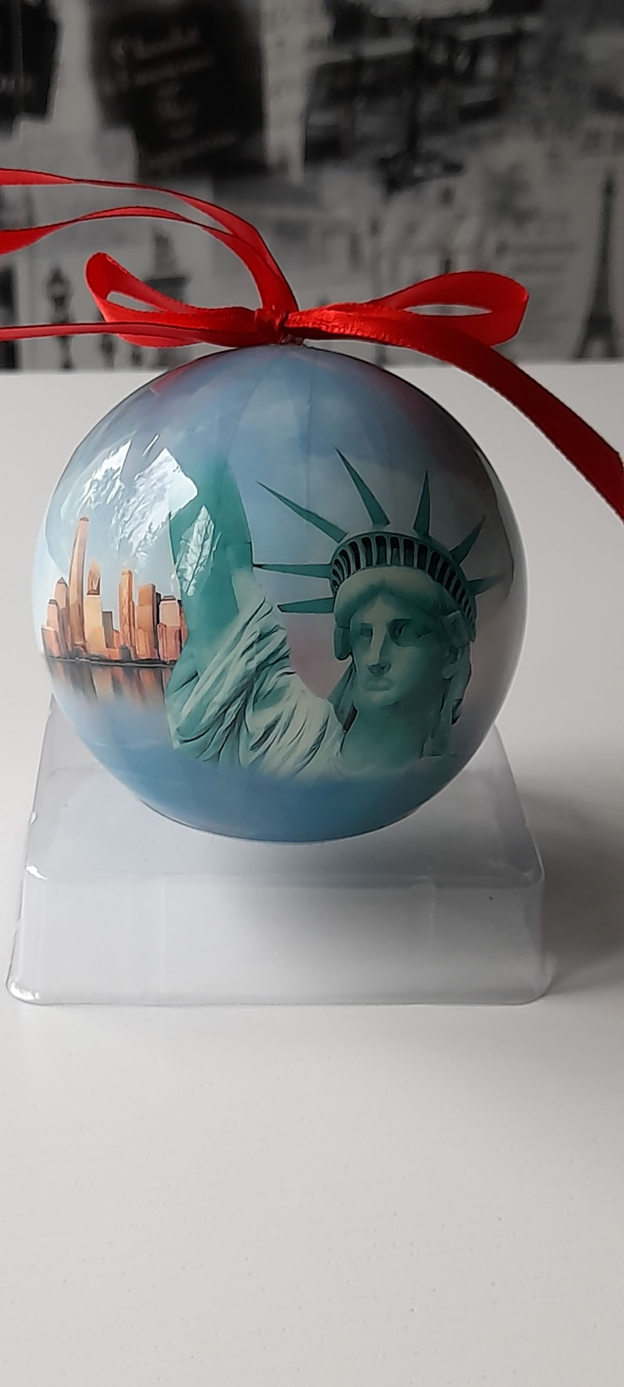 Sain läheisiltäni 50-vuotislahjaksi haaveilemani New Yorkin matkan. Pääideoijana oli rakas tyttäreni. Hänen kanssaan vietin ihanan viikon unelmieni kaupungissa. Vapauden patsaan juurelta ostin tämän joulupallon, joka saa kunniapaikan joulukuusessani vuodesta toiseen.