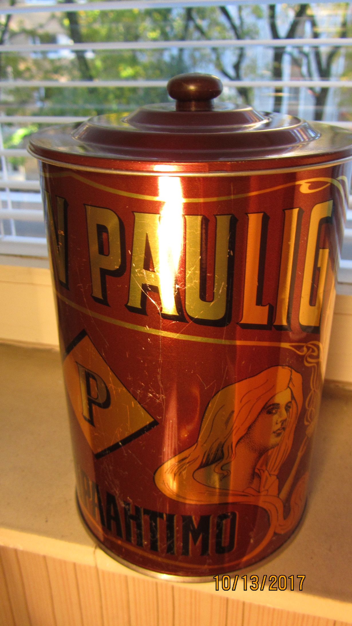 Mennessäni vuosikymmeniä sitten opintojani varten pääsykokeisiin sain silloisilta työtovereiltani evääksi purkillisen lakritsia. Se oli pakattu tähän Pauligin 100-vuotispeltitölkkiin, jonka malli ja koristelu ovat vuodelta 1904.