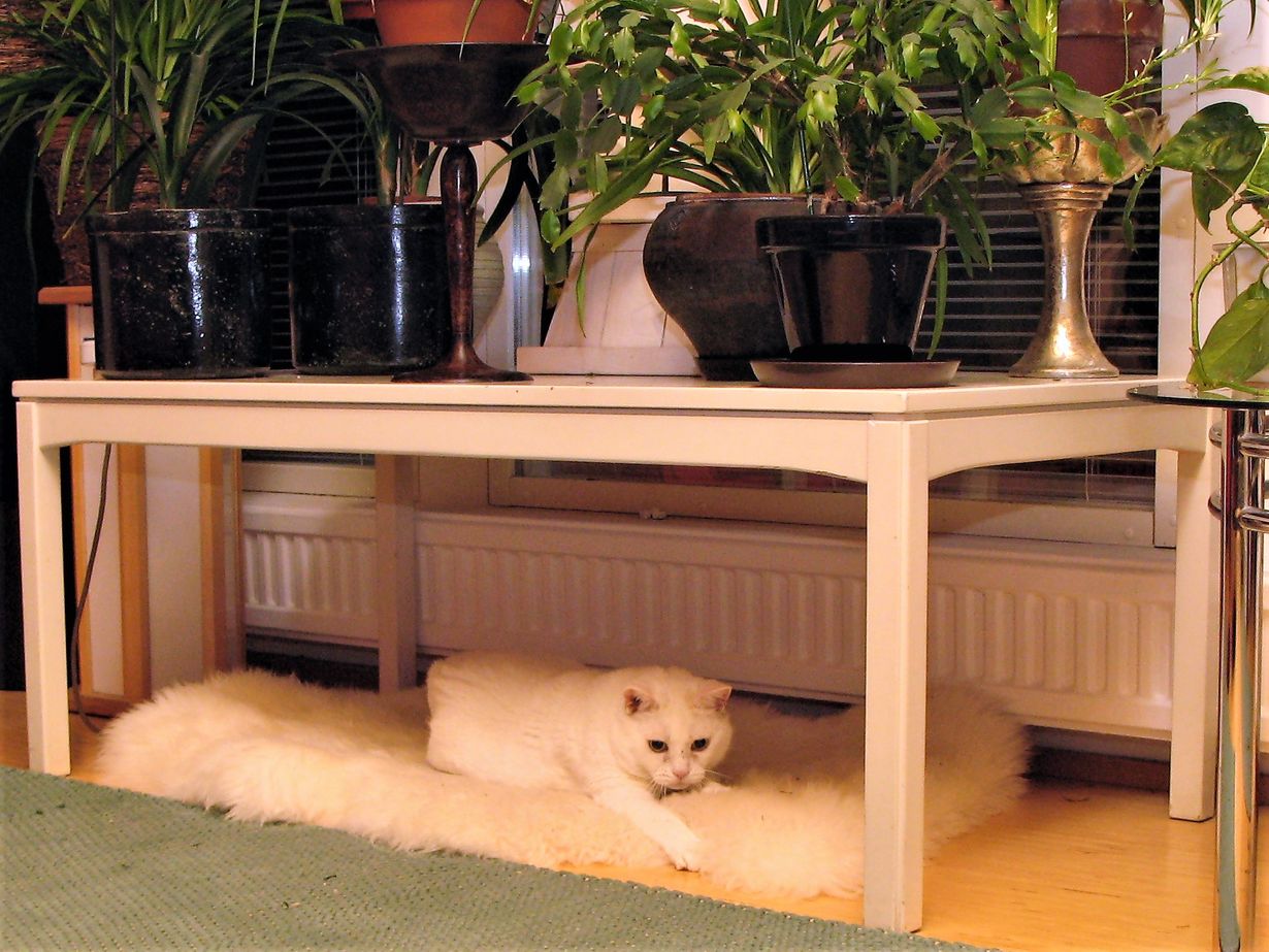 Olohuoneessa kukkapöydän alla oli lämmintä ja hyvä seurata ihmisten menoa.