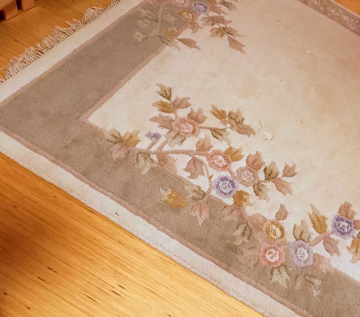 Rakensimme mieheni kanssa tiilisen omakotitalon 1960-luvulla, jossa edelleen asun. 1992 remontoimme olohuoneen katosta lattiaan ja remontin kunniaksi ostimme kaikki uudet huonekalut - myös uuden maton. Tämä matto on minulle rakkain matto; villanukkamatto ja kaunis kukkakuvio. Vuosien varrella pieniä elämän läikkiä on tarttunut sen pintaan, mutta yhä edelleen se on minusta niin kaunis ja koristaa edelleen talvisin olohuoneemme lattiaa.