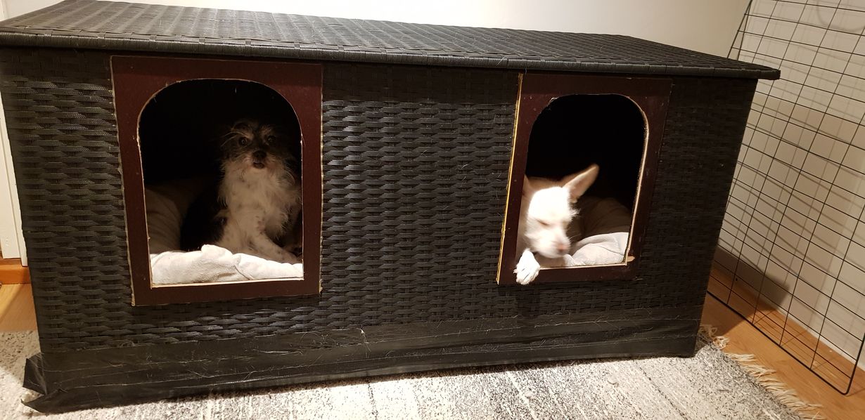 Mieheni teki koirillemme oman talon ulkopehmusteiden säilytyslaatikosta. Avattava kansi ja pyörät alla. On ollut kovin mieluinen.