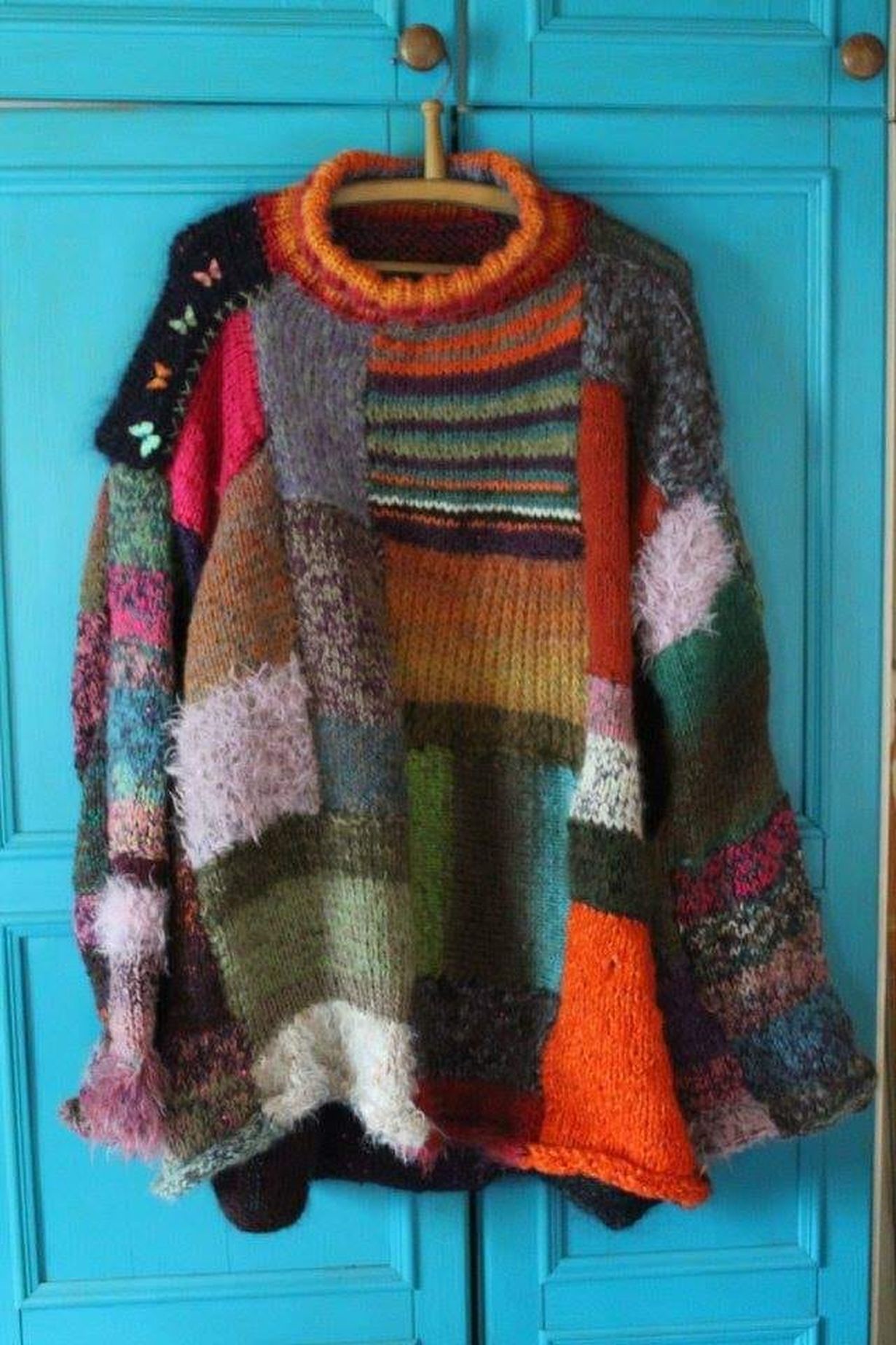Tämän villapuseron olen tehnyt eri langanlopuista ja vyyhtijämistä. Se on minulle rakas ja erittäin lämmin. Myös näyttävä ja helposti tunnistettava; taiteilija kun olen. :)