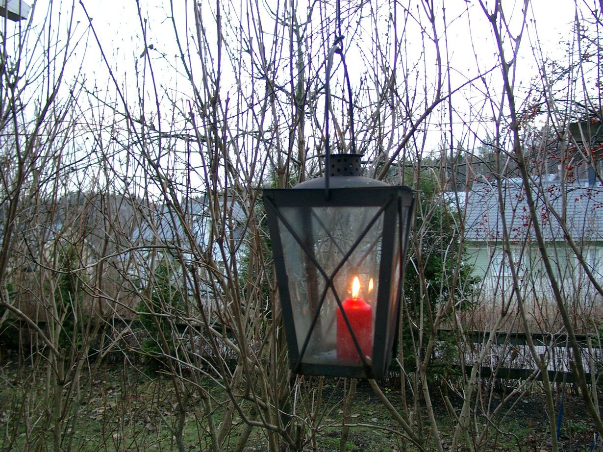 Omakotitalomme pihapiirin linnuille laitettu joulukynttilälyhty