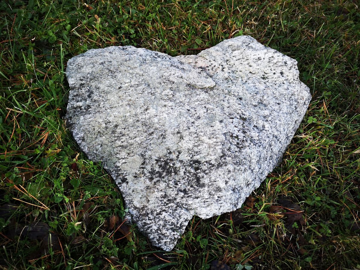 Meillä on hoidetun pihanurmialueen vieressä trimmerillä ajettava kivikkoinen heinikkoalue. Mieheni kanssa keväällä poistimme alueelta kiviä, jotta saisimme alueen leikkurilla ajettavaksi. Sieltä se kivinen sydän löytyi ja mieheni toi sen minulle suukon kera. Sydänkivellä on nyt paikkansa pihallamme kohdassa, jossa se ei ole leikkurin tiellä.