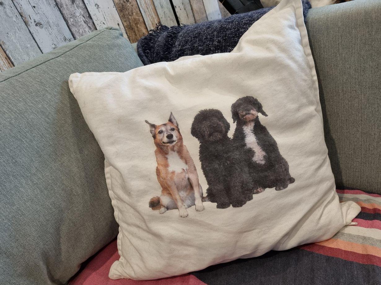 Sukulaiselta saimme lahjana tyynynpäällisen, johon oli painettu omien koiriemme kuvat. Nyt Joona, Turca ja Carlos ovat jo koirien taivaassa, mutta tämän tyynyn myötä päivittäin muistoissa.