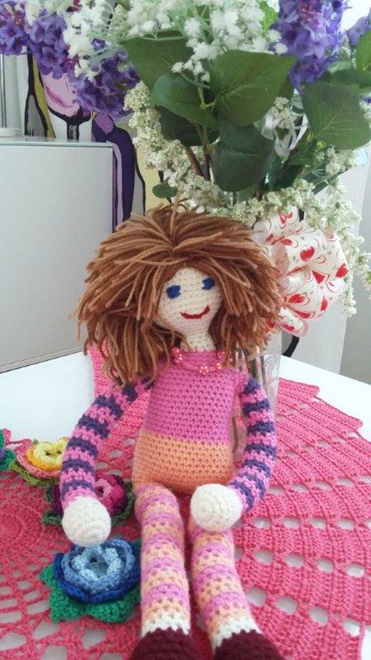 Pehmolelunani on itse virkkaamani mollamaija. Se on kiertänyt mukanani jo vuosia, ja löytää paikan milloin sohvan selkämykseltä, milloin ikkunalaudalta, milloin olohuoneen kukkakimpun alta, kuten kuvassa.
