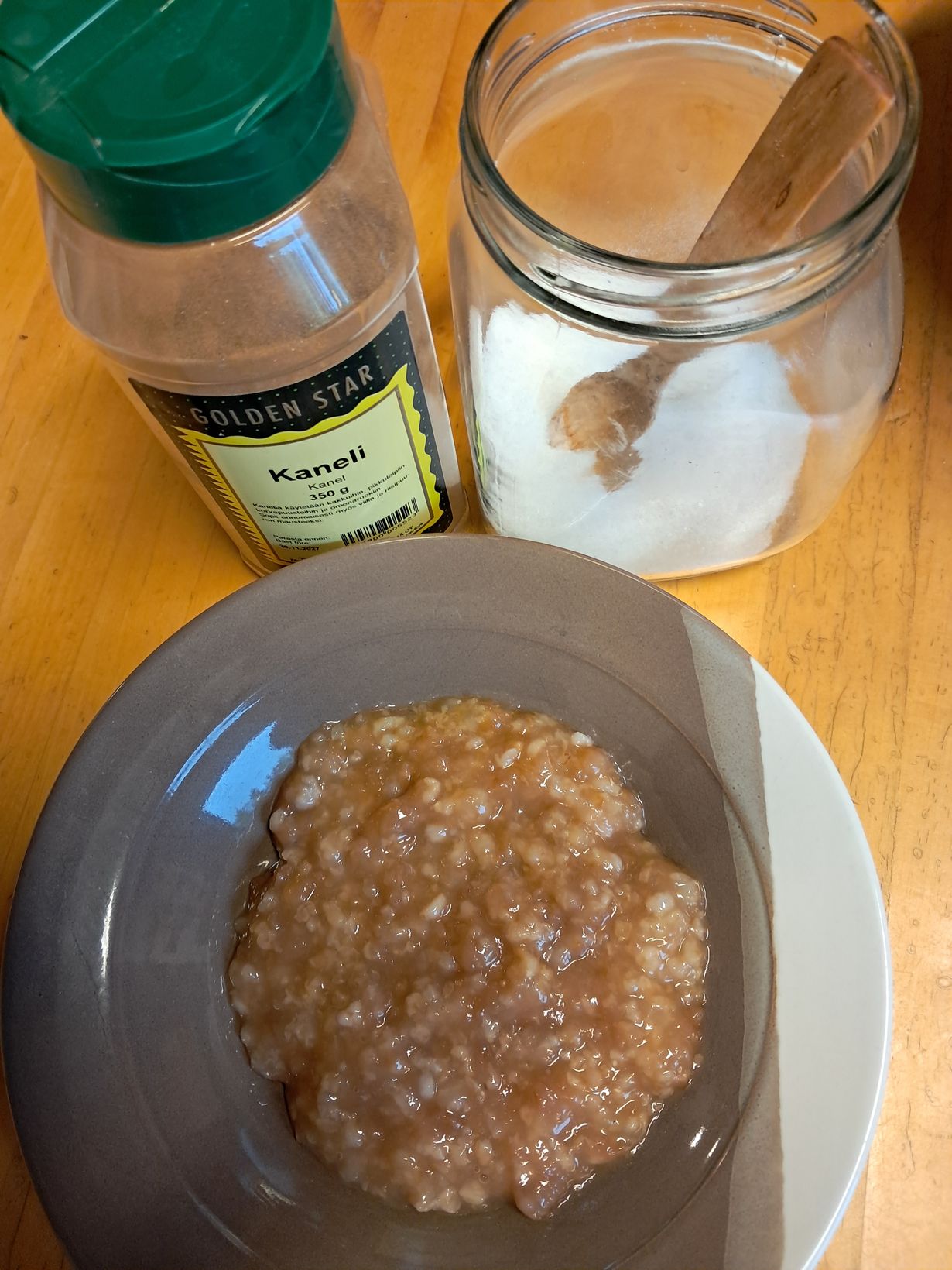 Pakasteomena siivuja ( omista omenapuista), puuroriisiä, vettä, siirappia ja ripaus suolaa. Syön kanelin, sokerin ja maidon kera.