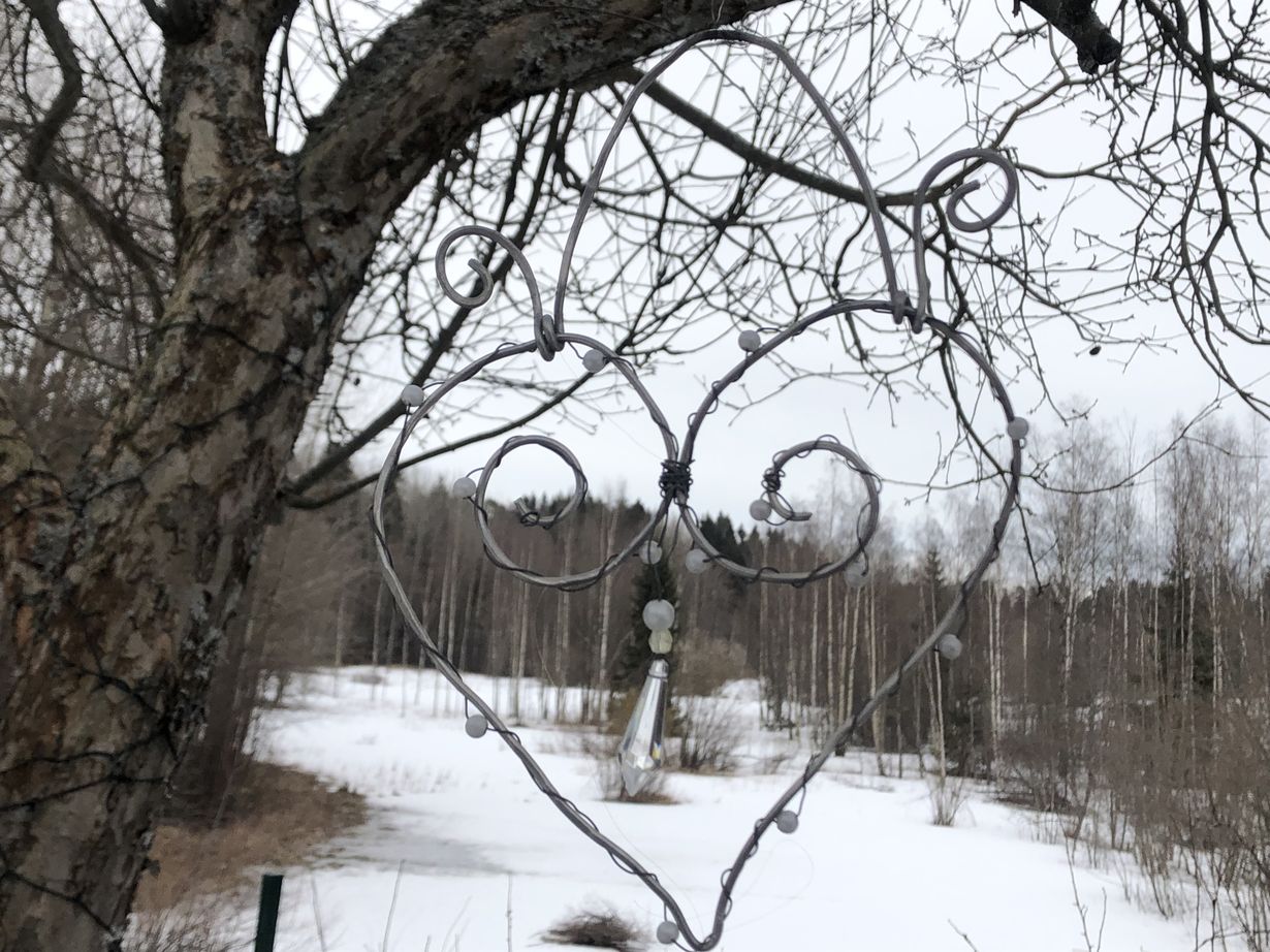 Tällaisia metallisia sydämiä - ystävältä saatuja - roikkuu muutama ympäri vuoden vanhaa omenapuuta koristamassa. Kesällä pilkottavat lehtien välistä ja talvella näkyvät parhaiten puussa olevien jouluvalojen loisteessa. Mutta ihan joka päivä niiden ”timantit” heijastavat niihin osuvaa valoa.