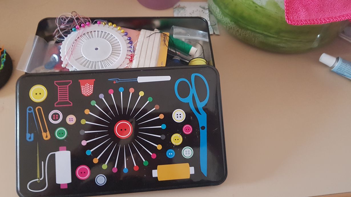 Sieltä löytyy neulat, langat, napit ja kaikkimuu oleellinen. :)