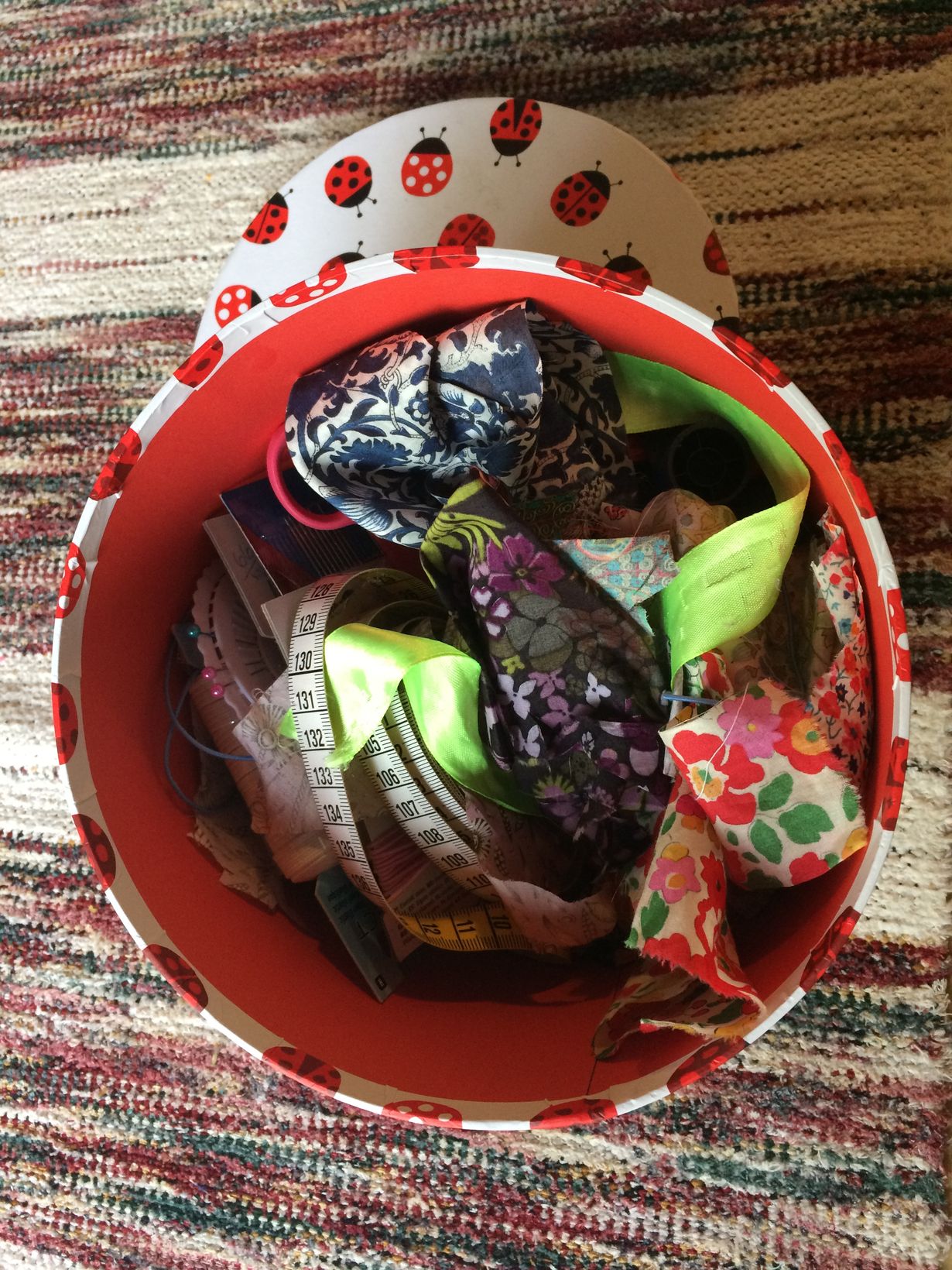 Ompelurasiani näyttää oikeasti ihan minulta. Epäjärjestyksessä ja koskaan tarvittava ei ole omalla paikallaan, mutta toisaalta löytyy joskun kivoja, täysin odottamattomia yllätyksiä kuten Liberty-kangastilkku tai väärään paikkaan eksynyt karkki.