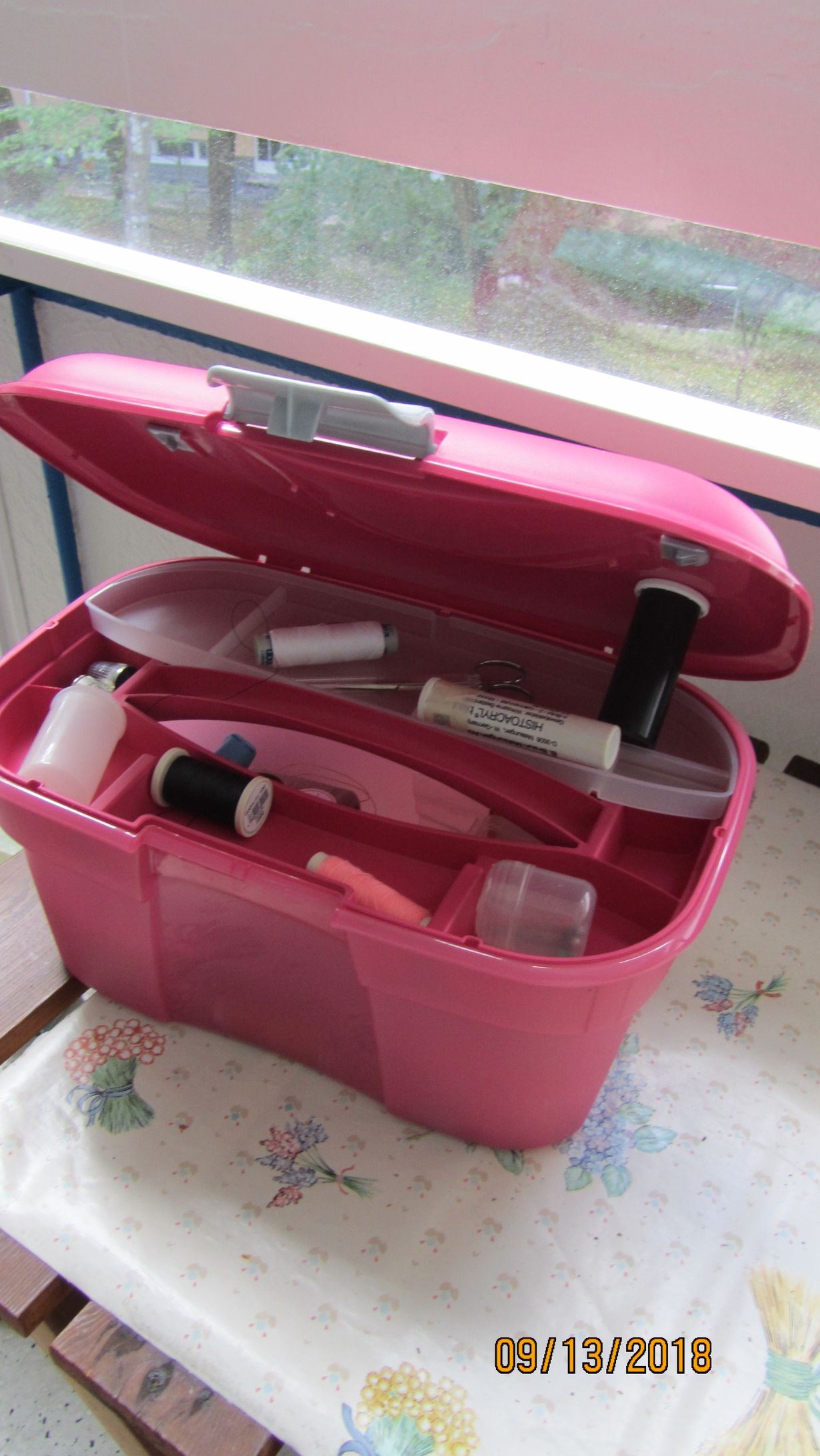 Ompelurasiani on alkuaan pieni työkalupakki, jossa naulat ja ruuvit vaihtuivat neuloihin ja lankoihin. Toimii kahdessa kerroksessa.