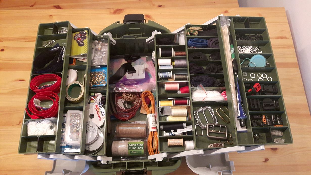 Ompelulaatikkona toimii tarpeeksi suuri uistinpakki. Löytyy riittävästi lokeroita ja kaiken näkee yhdellä silmäyksellä. Itsekin ompelutaitoinen aviomies osti tämän pakin, kun edellinen kävi liian pieneksi.