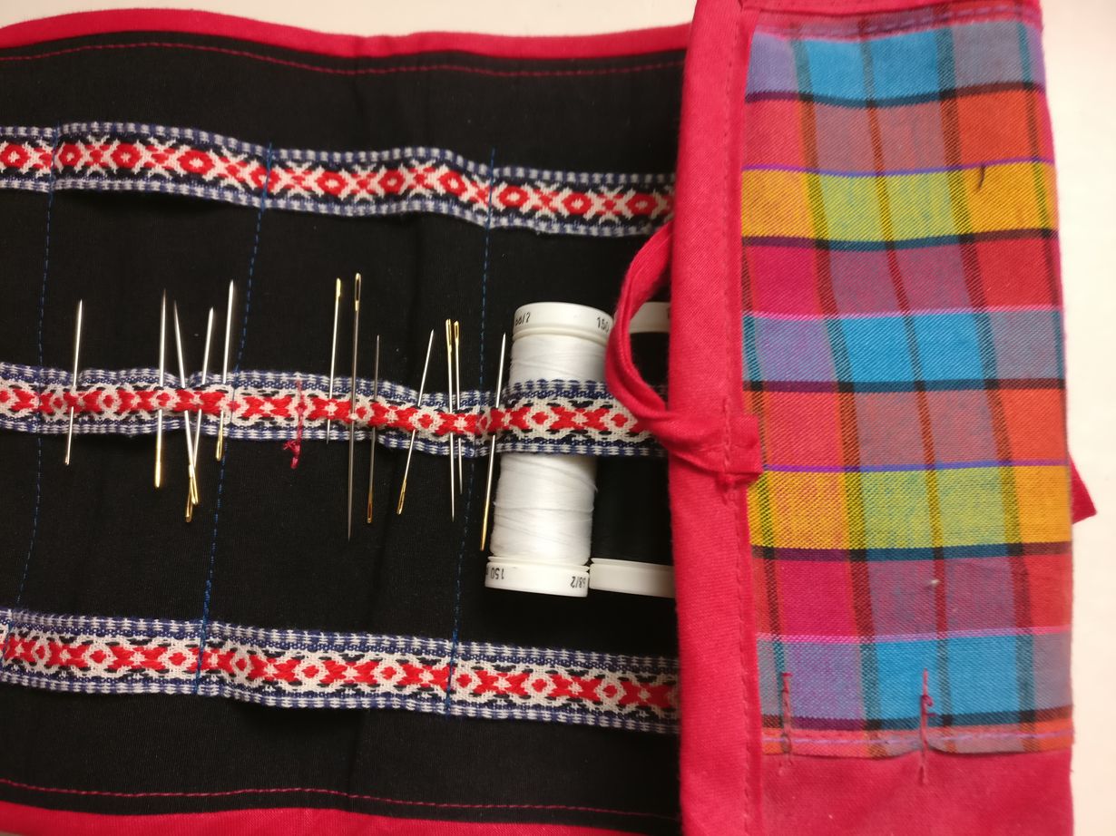 Ompelurasiani on itse asiassa kankainen kotelo johon mahtuu kaikki tärkein, muutama silmäneula ja lankarullat. Sen on tehnyt äitini ja se on ollut minulla käytössä jo vuosia.