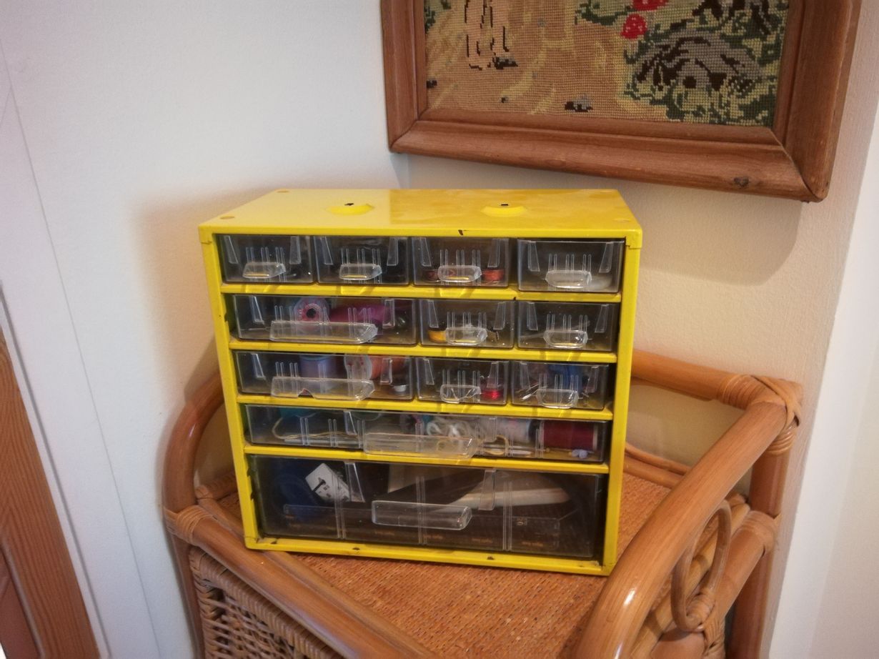 Rakkaan, edesmenneen äitimme tärkein työväline ompelukoneen ohella. Sieltä löytyy edelleen kaikki tarpeellinen niin lastemme kuin itsenikin käyttöön.