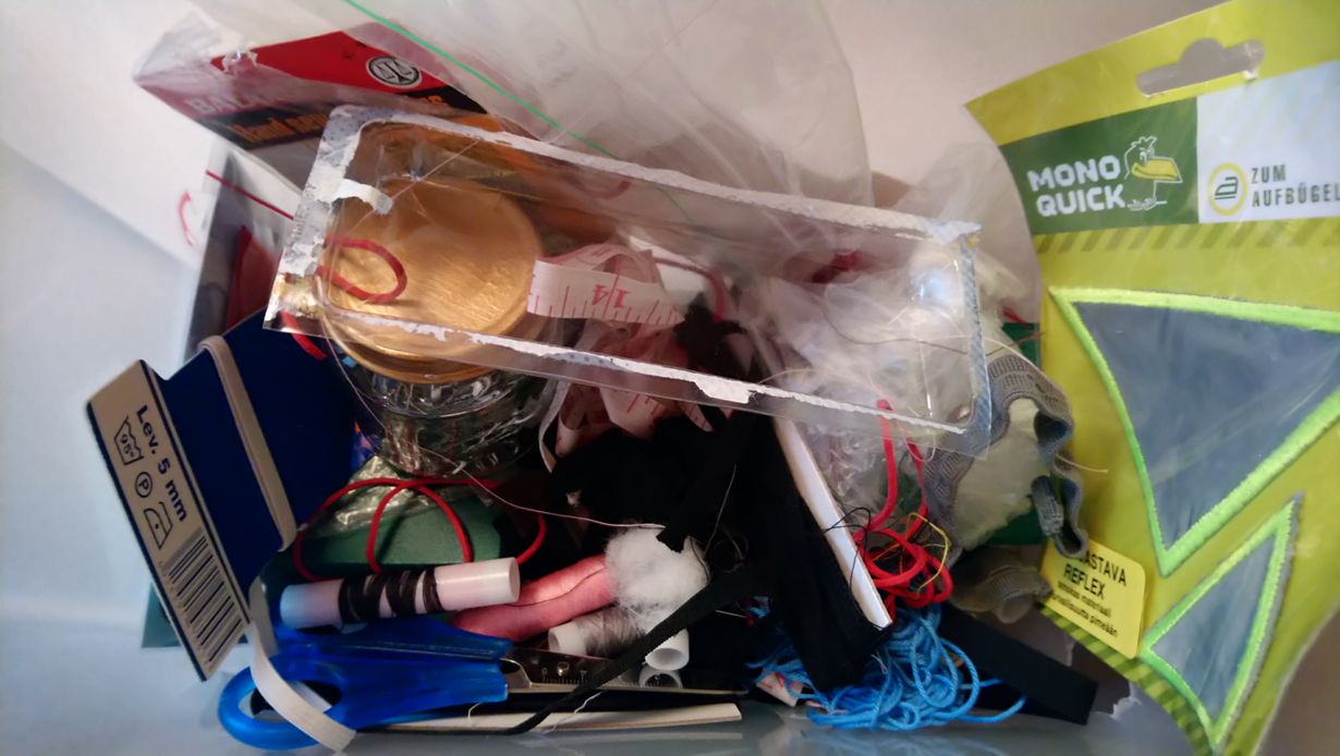 Ompelulaatikossani vallitsee hallittu kaaos, niinkun tällä hetkellä elämässäkin, kolmen lapsen ja aikataulujen hallinnan kanssa. Ns ruuhkavuodet meneillään ja laatikko kaivetaan esille lähinnä silloin kun paikataan esim rikkinäisiä polvia lasten housuista. Neulat löytyy ja sopiva valikoima erivärisiä lankoja.