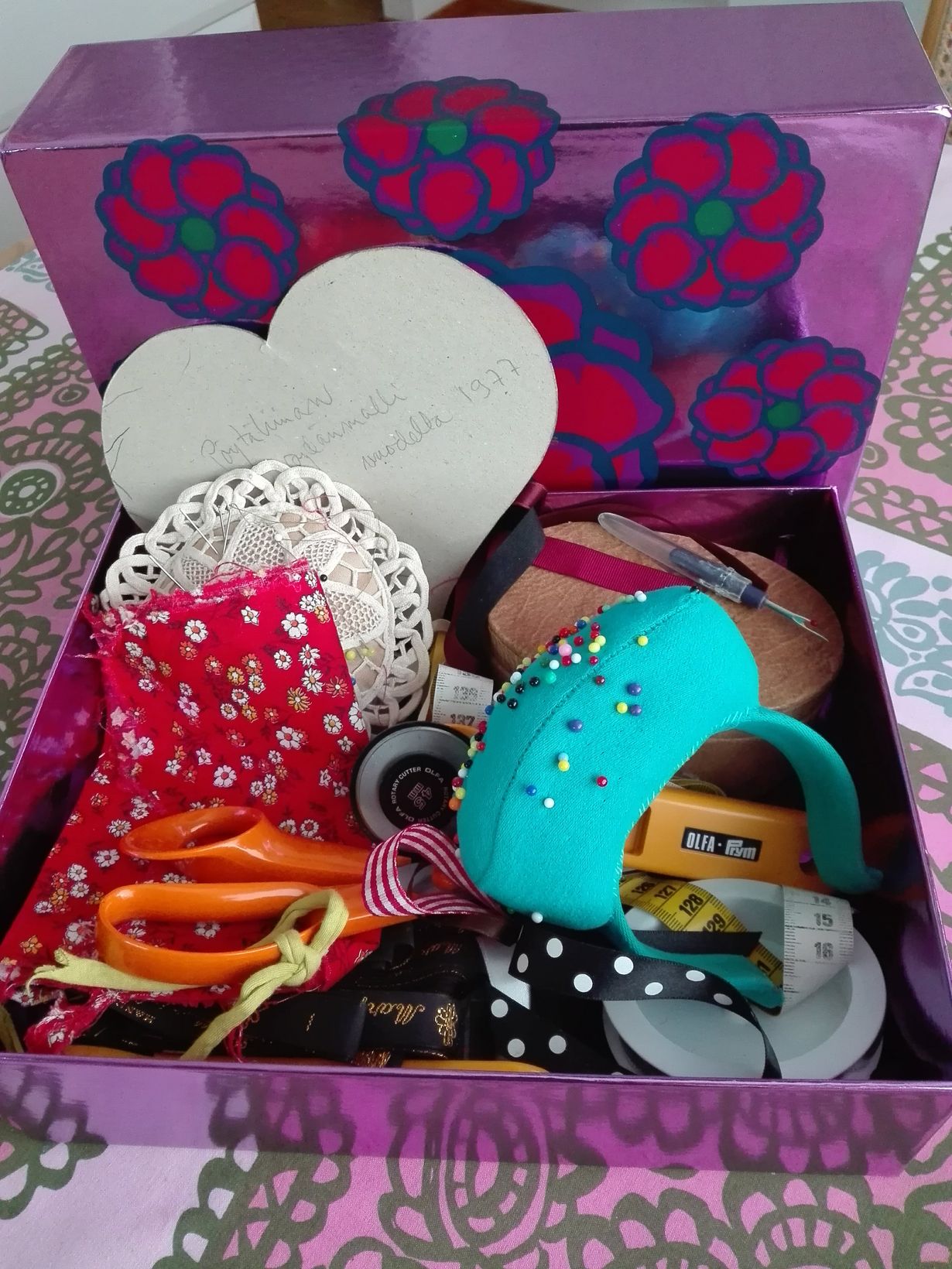 Tuoksulahjapakkauksesta tuli hyvä ompelurasia, sinne saa järjestykseen kaiken pikaisesti tarvittavan. Täältä löytyy aina myös joulusydämen kaava vuodelta 1977. Punainen kangas, odottaa jo pääsyä joululiinaan muiden vuosien varrella ommeltujen sydänten joukkoon.