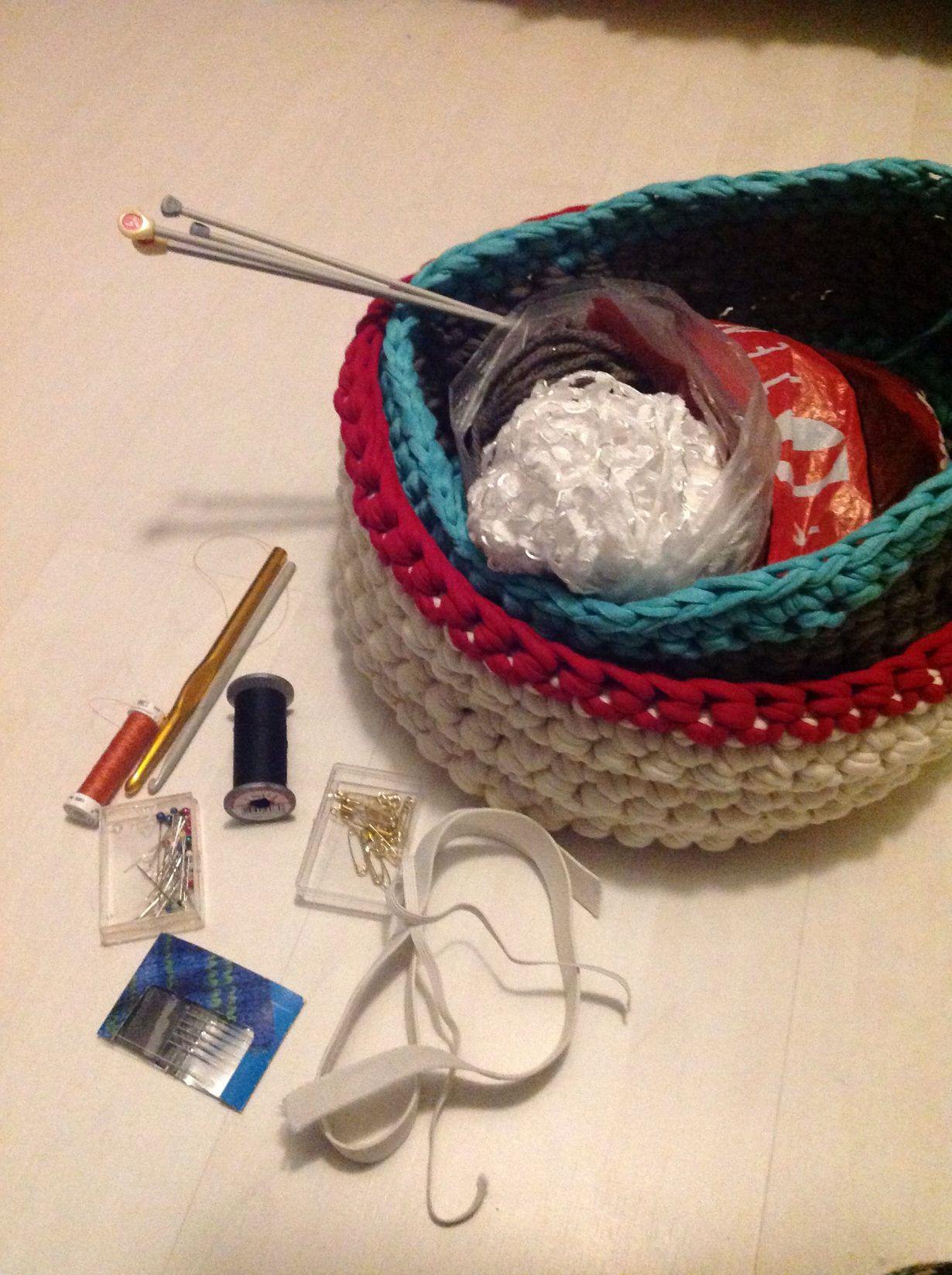 Ompelurasiani sisältö on todella niukkaa. En itse omista ompelukonetta, mutta mieluusti pienet korjaustyöt teen itse neulalla ja langalla. Lisäksi satunnaisia neulonta- ja virkkauskokeiluja, joihin olen lainannut äidiltäni puikkoja ja koukkuja. Onneksi saan tarvittaessa hipsiä äidin tai siskoni ompelukonetta lainaamaan isompia töitä varten. Ompelurasian virkaa toimittaa harjoitustöinä valmistuneet virkatut korit.