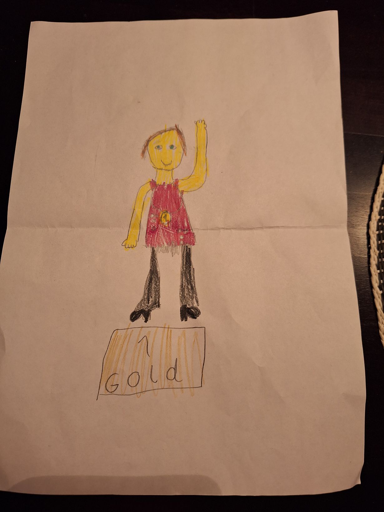 Tämä piirros on 8-vuotiaan lapsenlapseni Adan tekemä ennen meidän tanssikisoja. Harrastan lattaritansseja kuuden aikuisen naisen ryhmässä ja ennen ryhmämme ensimmäisiä kisoja, Ada toivotti meille onnea tällä piirroksella. Hän oli sitä mieltä, että kultaa tulee! Ei ihan tullut😉, mutta hauskaa meillä oli, ja piirros ja lapsenlapsen kannustus lämmitti mieltä ❤️.