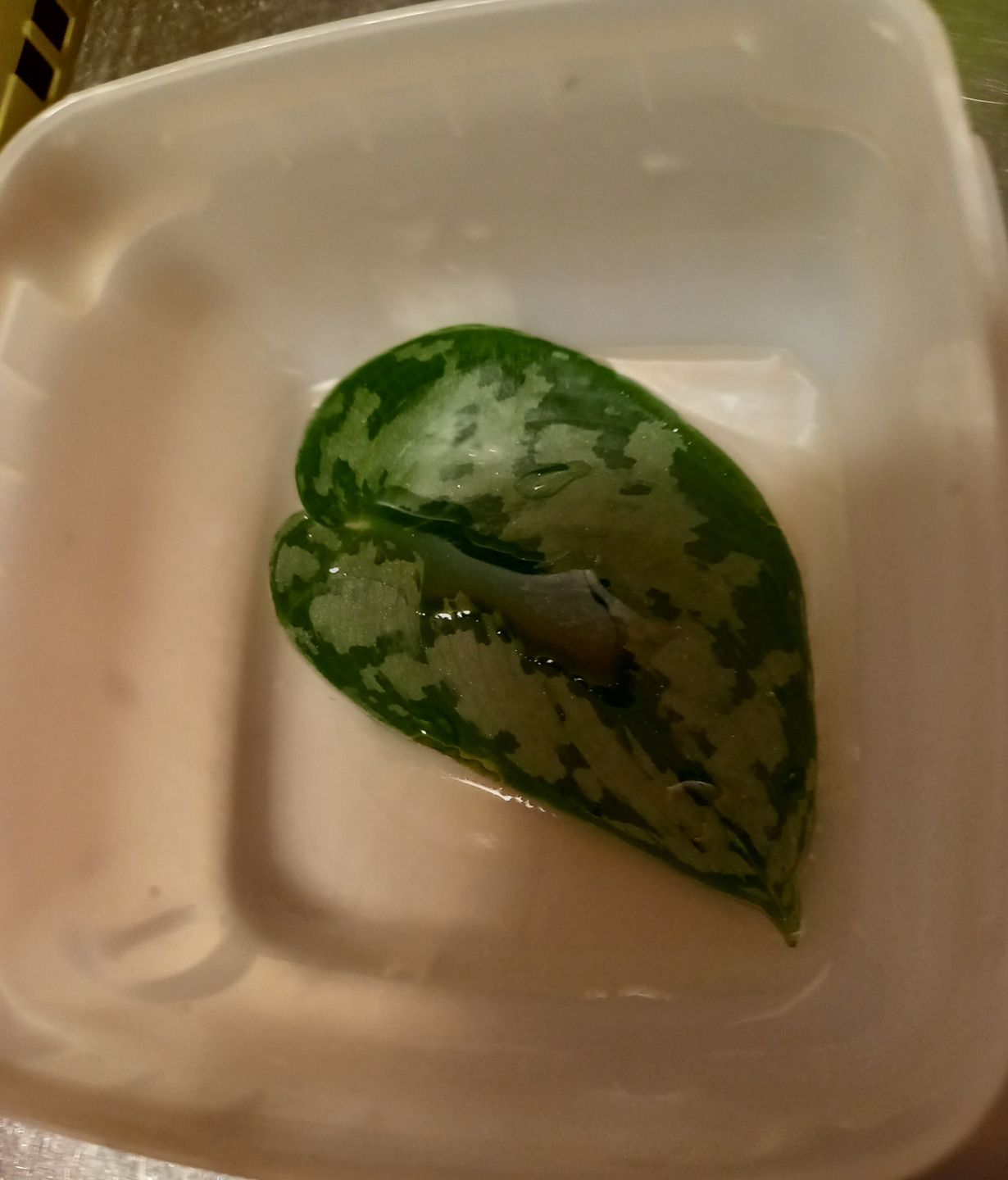 Unohdan viherkasvieni nimet. Lapsi repäisi yhdestä lehden. Kokeilen onnistuuko juurien kasvattaminen vedessä vai pitääkö lyhyt varsi laittaa multaan.