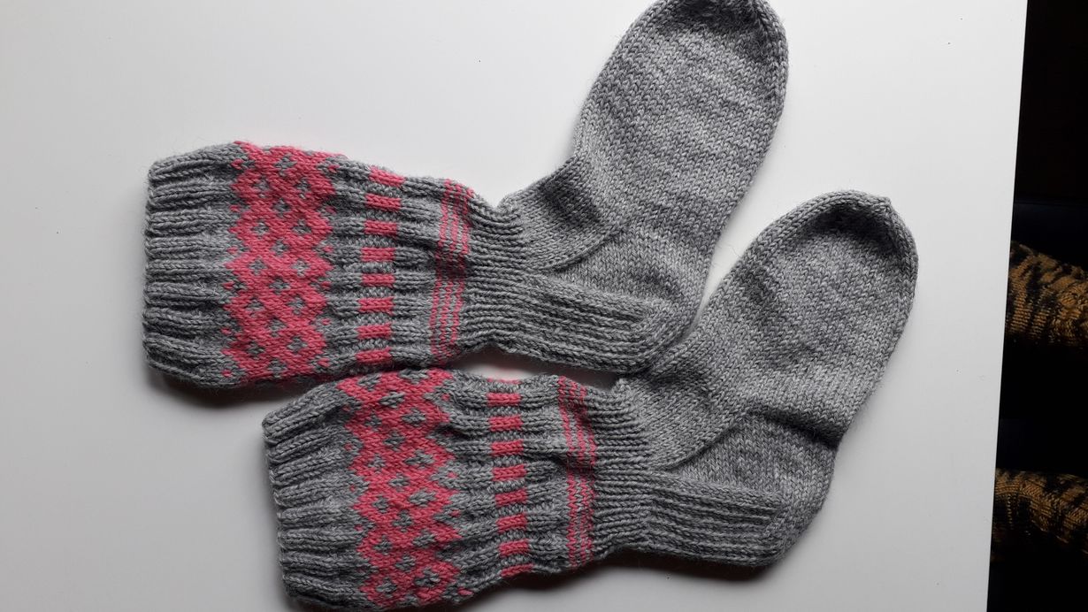 Lapsi lähti opiskelemaan 400 km päähän. Opiskelupaikalla vuokrattiin opiskeluasunto ja sinne tarvittiin tietenkin villasukat joita voi käyttää aina iltaisin, ettei jalat palellu. Pinkistä ja harmaasta piti sukat kutoa.