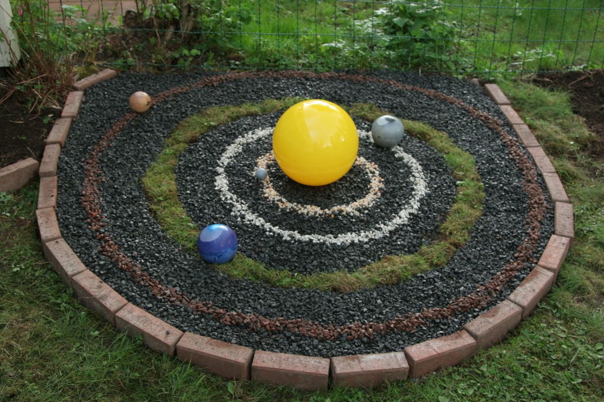 Takapihan koristeena manuaalinen orraario eli aurinkokuntamalli, jossa ovat mukana kiviplaneetat Marsiin asti. Venus, Maa ja Mars ovat pallokynttilöitä, Merkurius on golfpallo. Aurinko on lampun kupu, jonka sisällä on sykkyrällä sähkökynttiläsarja valaisemaan palloa iltaisin. Planeettoja liikutellaan kesän aikana vähitellen siten, että niiden paikka vastaa planeettojen todellista asemaa. Maapallon asemaa elämän vyöhykkeellä kuvaa sen ratana toimiva nurmikaistale; muiden planeettojen radat on merkitty erilaisilla koristesorilla. Malli tuo konkreettisesti esiin sen, että sopiva etäisyys Auringosta mahdollistaa elämän ja puutarhanhoidon täällä Maassa!