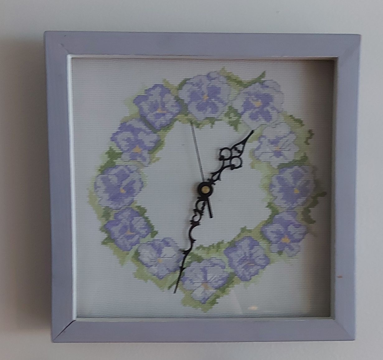 Pyysin Isääni maalaamaan minulle orvokki taulun keitiööni. Tulikin astetta hienompi kello. Äidin ja Isän yhteistyö.
