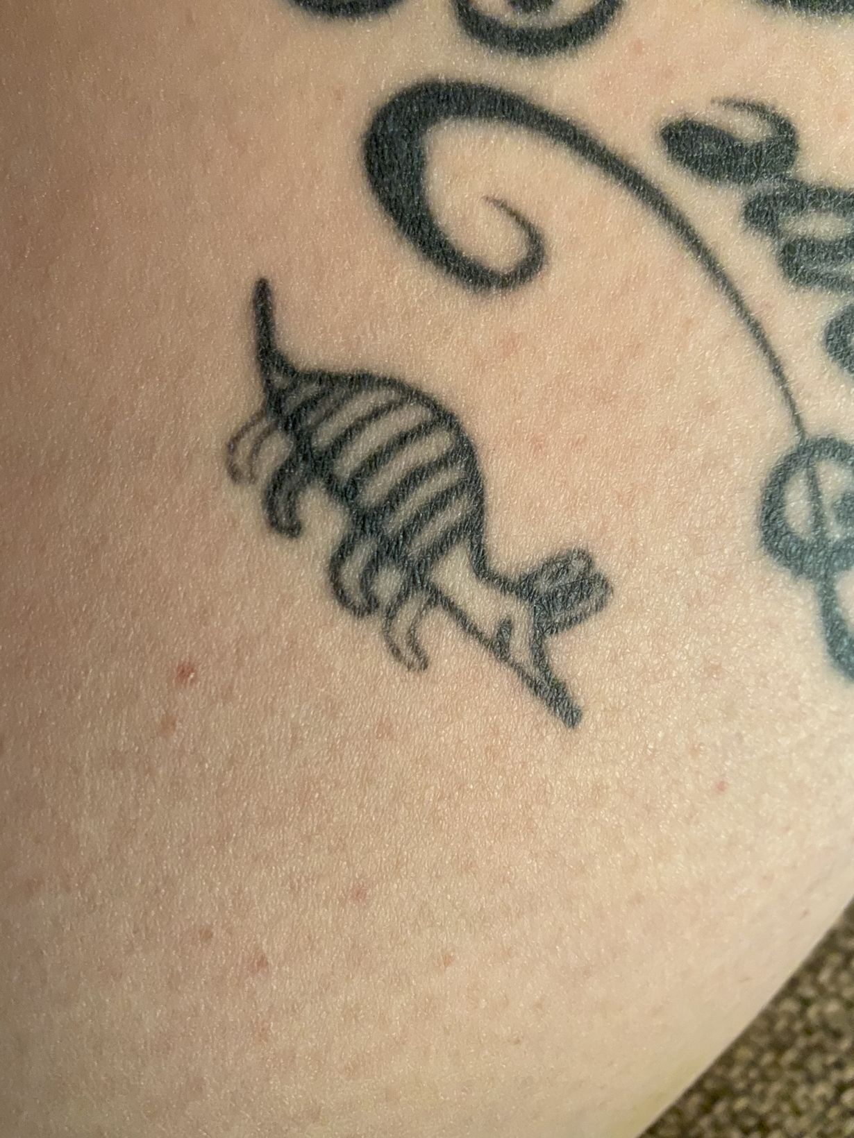 Olen ollut mieheni kanssa pian 20 vuotta yhdessä. Kun tapasimme, hän piirsi minulle otuksen josta pidin sen kummallisuuden vuoksi. Otin vuosia myöhemmin saman piirroksen tatuointina reiteeni yllätyksenä ja rakkaudenosoituksena kumppanilleni. Otus on kuulemma vompatti.