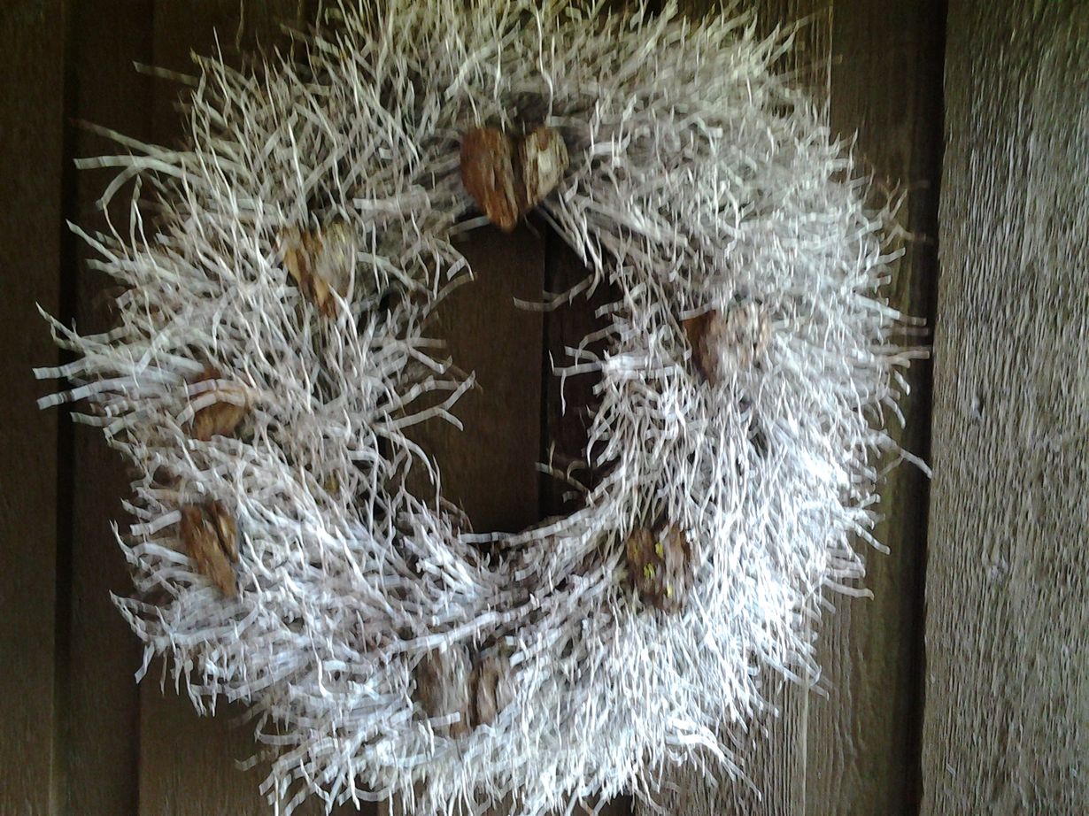 Mustikanvarpukranssi joka on spreijattu vakoiseksi. Sydämet on tehty männynkaarnasta