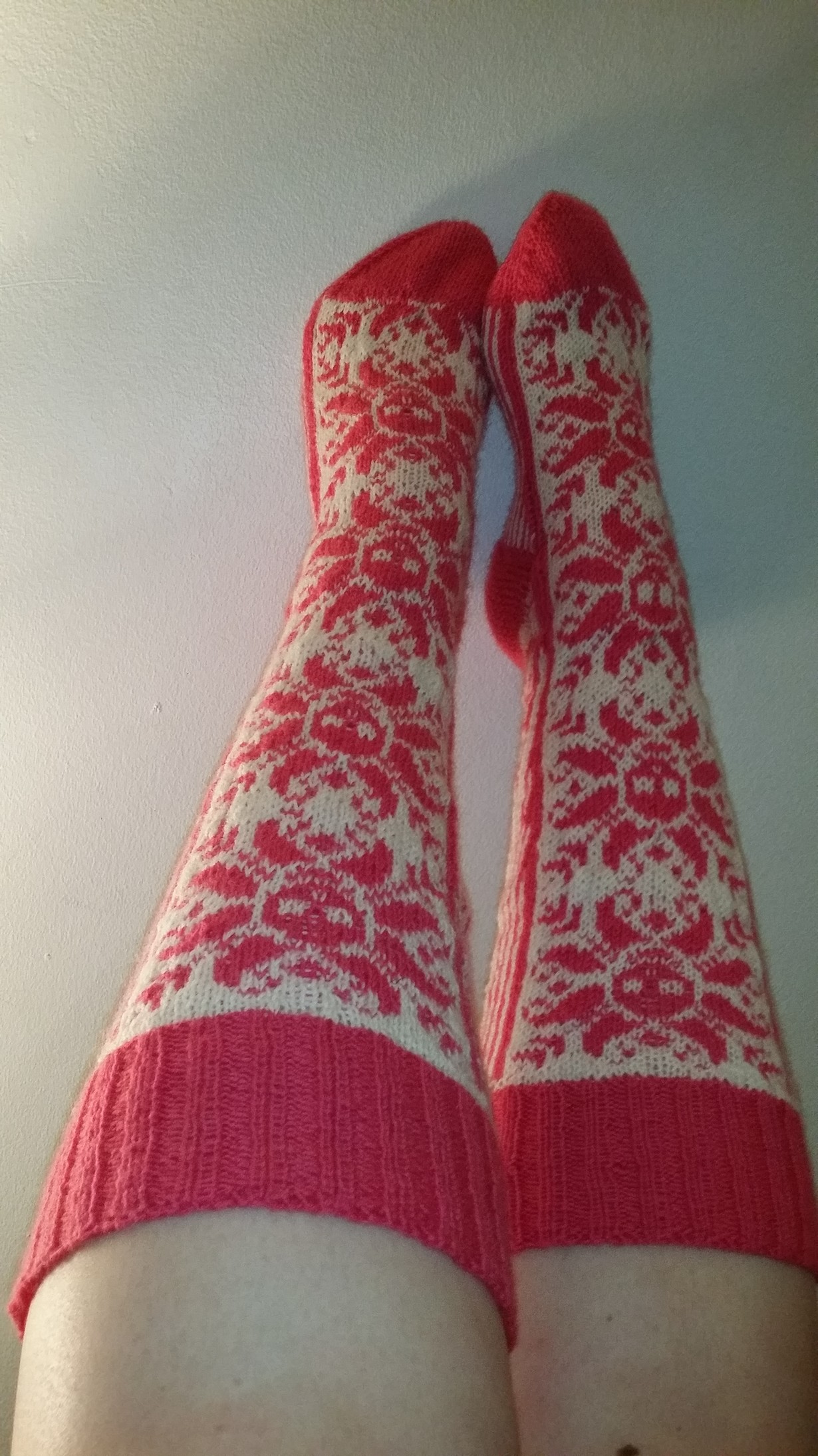 Selbudeath-sukat oli mulle tosi suuritöiset ja niissä oli paljon uusia juttuja: ensimmäiset polvisukat ja ensimmäiset kirjoneulesukat, ensimmäistä kertaa kokeilin myös höyryttämistä viimeistelyssä. Käytin eri lankaa kuin yleensä, ettei ohjeen kanssa tarvinnut alkaa säätämään ja olin ostanut uudet puikotkin, kahdet. Neuloin näitä vuorotellen, senkin takia että ei olisi tullut sitä ongelmaa että toisen sukan aloittaminen olisi venähtänyt. Olin supertyytyväinen kun sain ne valmiiksi. Seuraavana projektina oli tutut ja turvalliset perussukat - joskus pitää kuitenkin haastaa itseään kokeilemaan uutta! Teen tällä mallilla vielä joskus toisetkin sukat :)