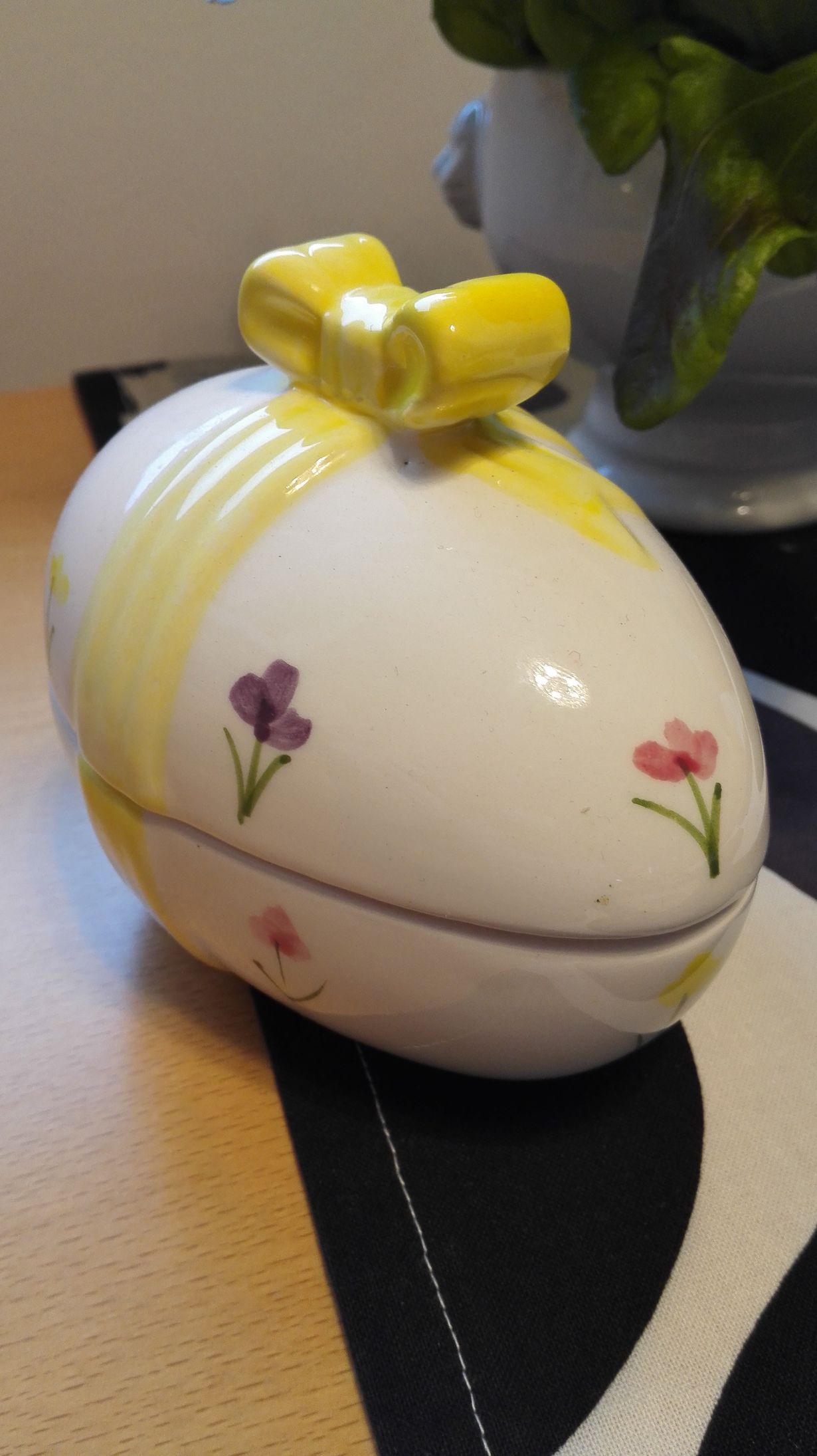 Tämä posliinimuna on lapsuudenkotini peruja. Pääsiäismuna oli lapsuuteni pääsiäisten kohokohta, sillä se löytyi aina piirongin reunalta täynnä pääsiäisherkkuja.