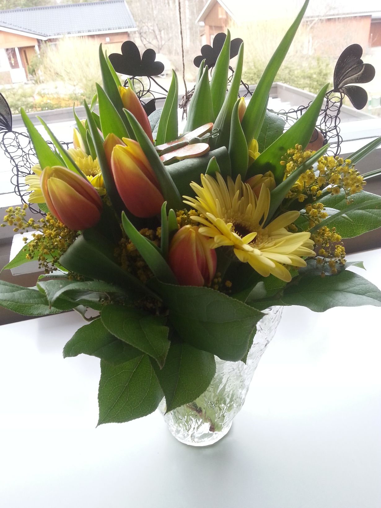 Mieheni tietää, että rakastan kukkia. Niinpä hän tulee aina välillä kukkakaupan kautta töistä kotiin. Tämän kimpun sain täksi pääsiäiseksi.