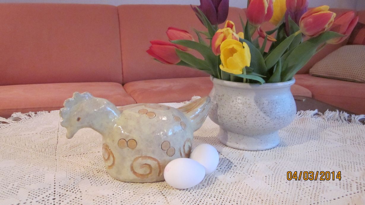 Olen yli 70v eläkeläinen. Ollut vuosia keramiikkakursseilla. Muutama vuosi sitten oli " pääsiäistipu" POP. Tämä koristaa pääsiäisen aikana pöytää rairuohon keskellä ja värikkäitä munia ympärillään.