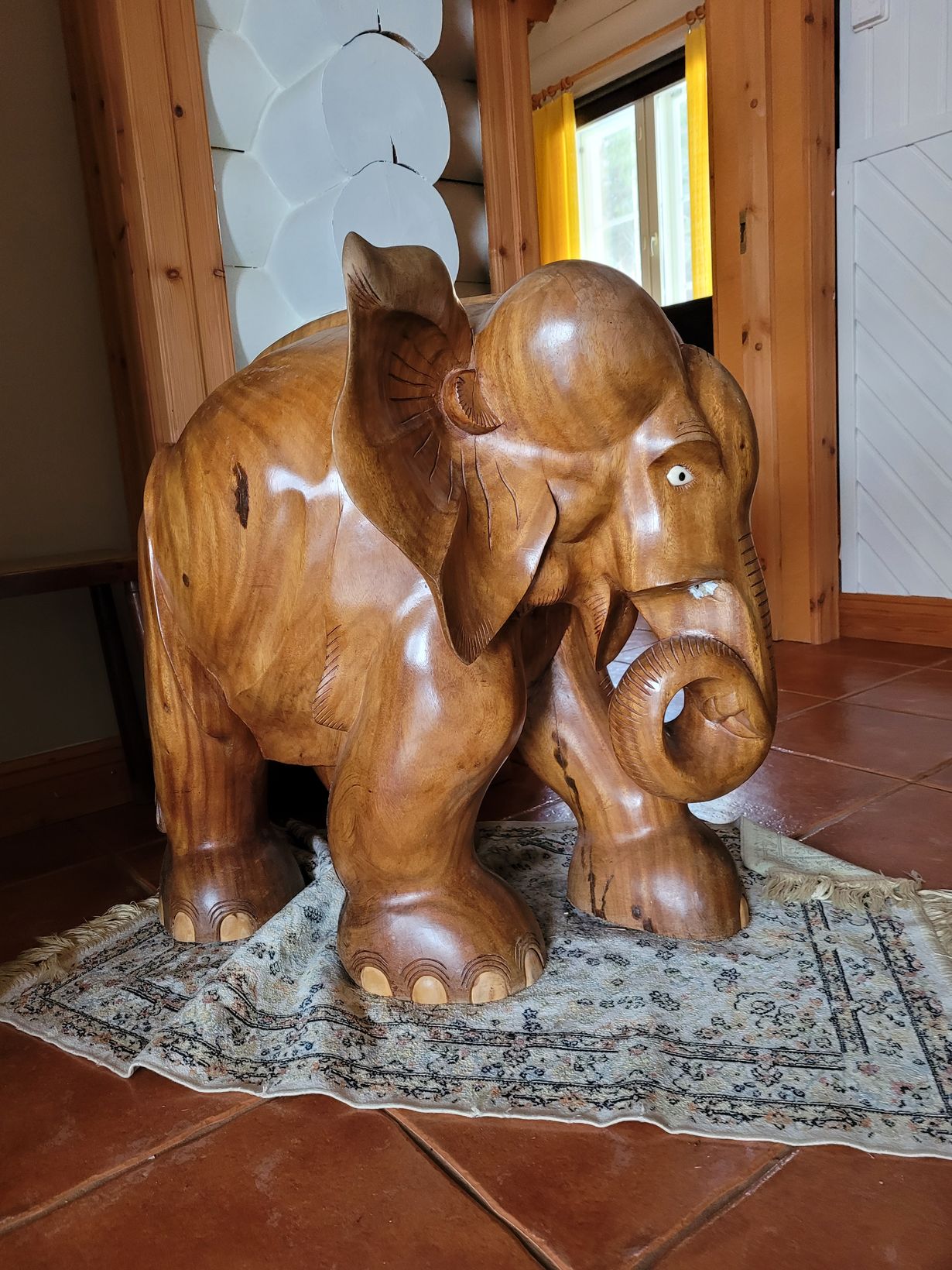 Lomamatkamme Sri Lankaan v. 1995 oli jännittävä ja ainutlaatuinen silloisen maan tilanteen vuoksi. Nautimme auringosta ja kaikesta näkemästämme. Nyt jälkeenpäin muistelemme seikkailua, jonka matkamuistomme sai aikaan. Yhdessä kanssamme saapui Suomeen tämä norsu, sen syöksyhampaat olemme laittaneet talteen turvallisuussyistä, etteivät pienet lapsenlapset satuttaisi itseään ratsastaessaan norsulla. Norsu on 80cm korkea, samoin pituus, leveys n. 50cm. Tuoreena vastaveistettynä sen paino oli 110 kg, yhä nykyäänkin se painaa paljon, pikkumatolla saan siirreltyä sitä lattialla. Arvaattekin, ettei matkamuisto mahtunut matkalaukkuun tulomatkalla.
