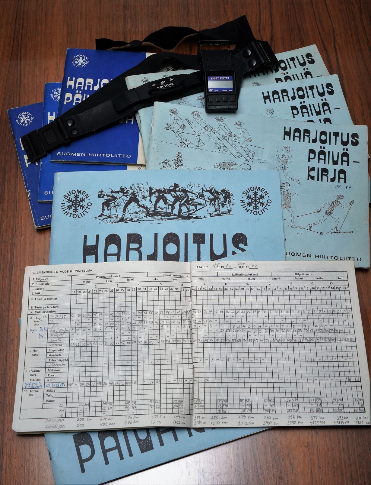 Harjoituspäiväkirjoja 80 luvulta. Hikeä, tuhansia kilometrejä ja satoja tunteja vuosittain. Hiihto, juoksu ja suunnistus.