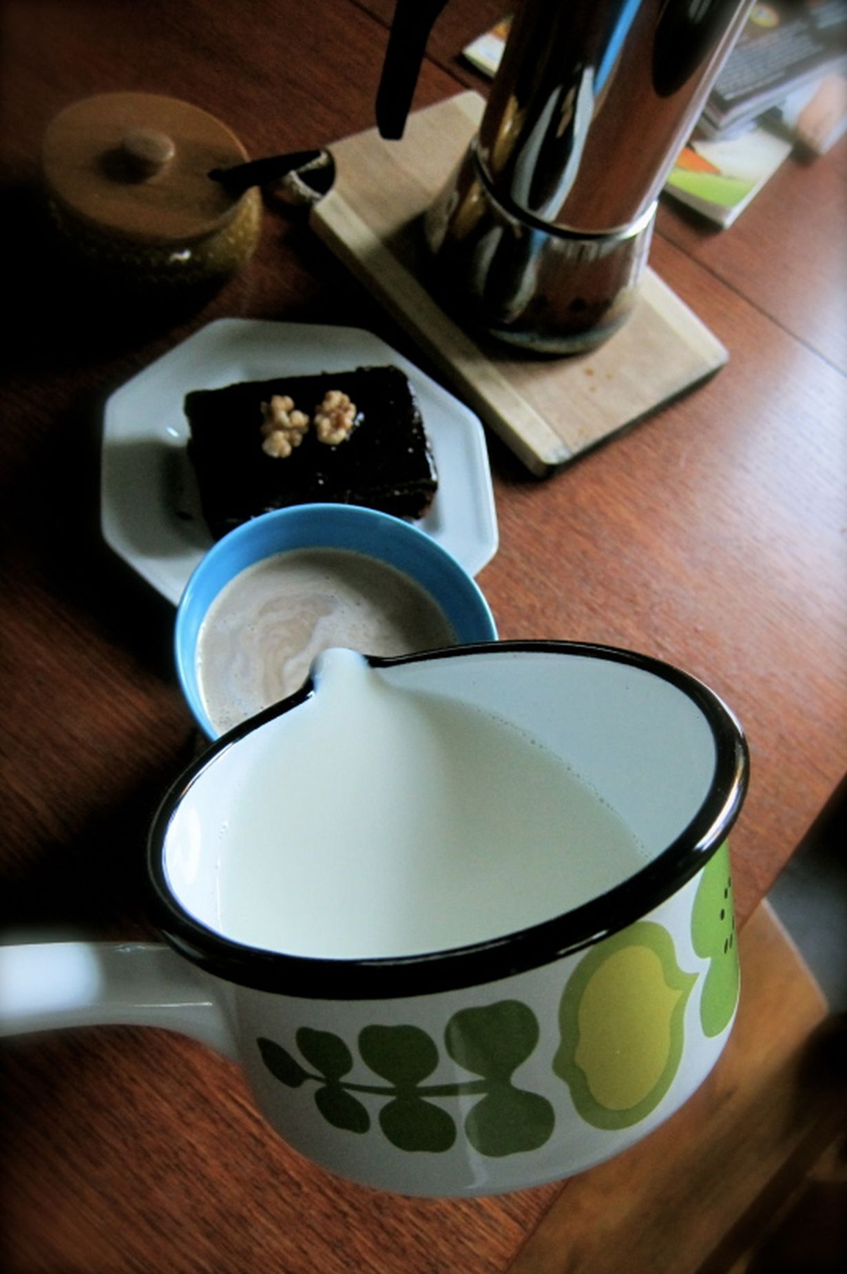 Päivät pitkät kotona vauvelin kanssa. Omasta kahvihetkestä herkun kera on muodostunut yllättävän tärkeä iltapäivärituaali. Lattemaito lämpiäisi toki mikrossa, mutta mielummin kuumennan sen tässä pirteässä emalikattilassa ja katan muutenkin nätisti. Olen järkevä kuluttaja, mutta tämä kattila oli silkka heräteostos; olivat ovelat sujauttaneet sen ruokakaupan käytävälle tarjouskyltin kera. No, ei tullut kalliiksi ja kaunis astia tuottaa iloa!