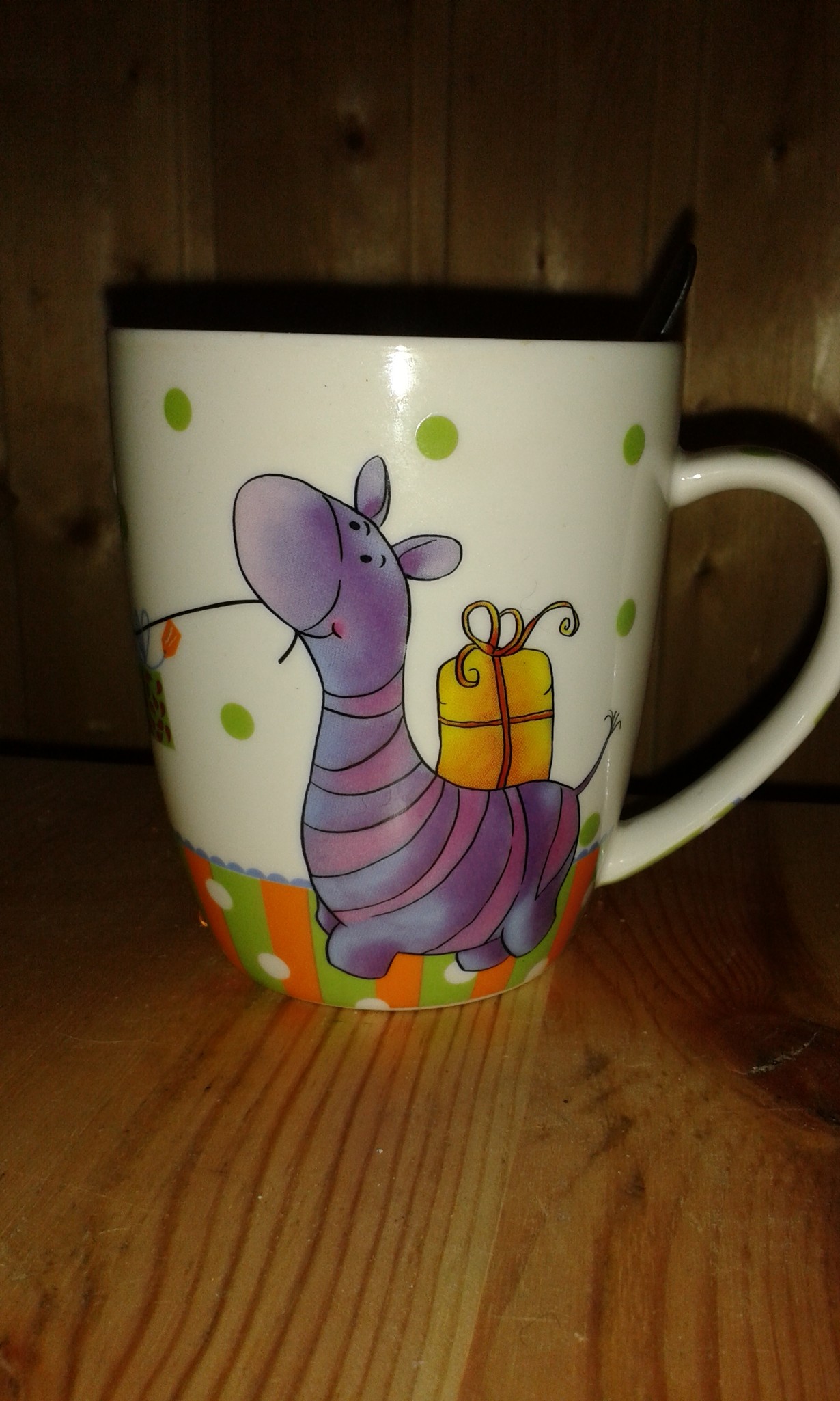 Edellinen lempparimuki oli lahja kaverilta mutta se hajosi. Pitkään etsin seuraavaa lempparimukia ja jouduin välissä tyytymään normimukeihin. Mutta sitten "se oikea" sattui alelaarissa kohdalle. Tärkeintä mukissa on se että siitä tulee hyvälle tuulelle :)