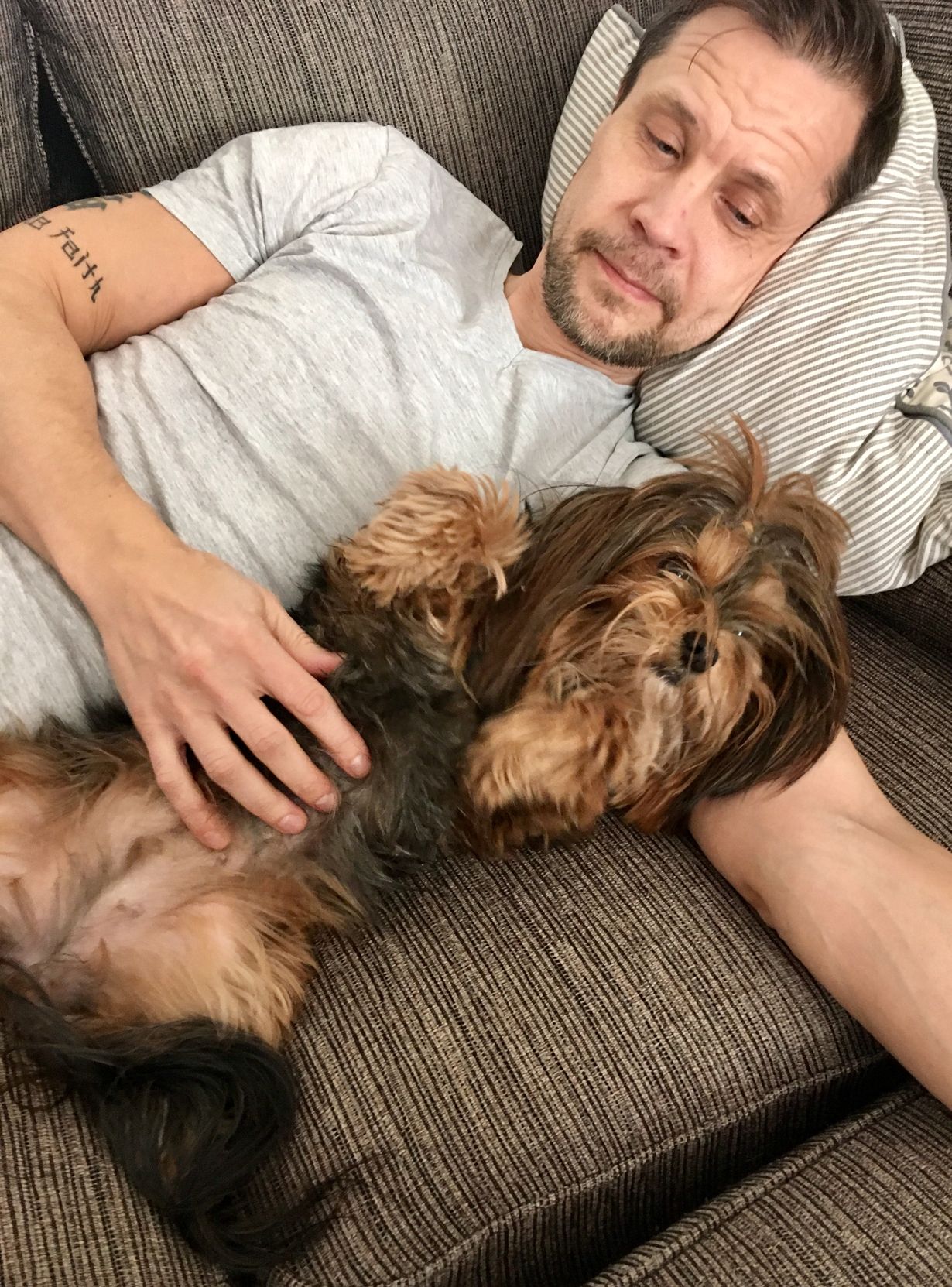 Lepohetki sohvalla koira kainalossa.