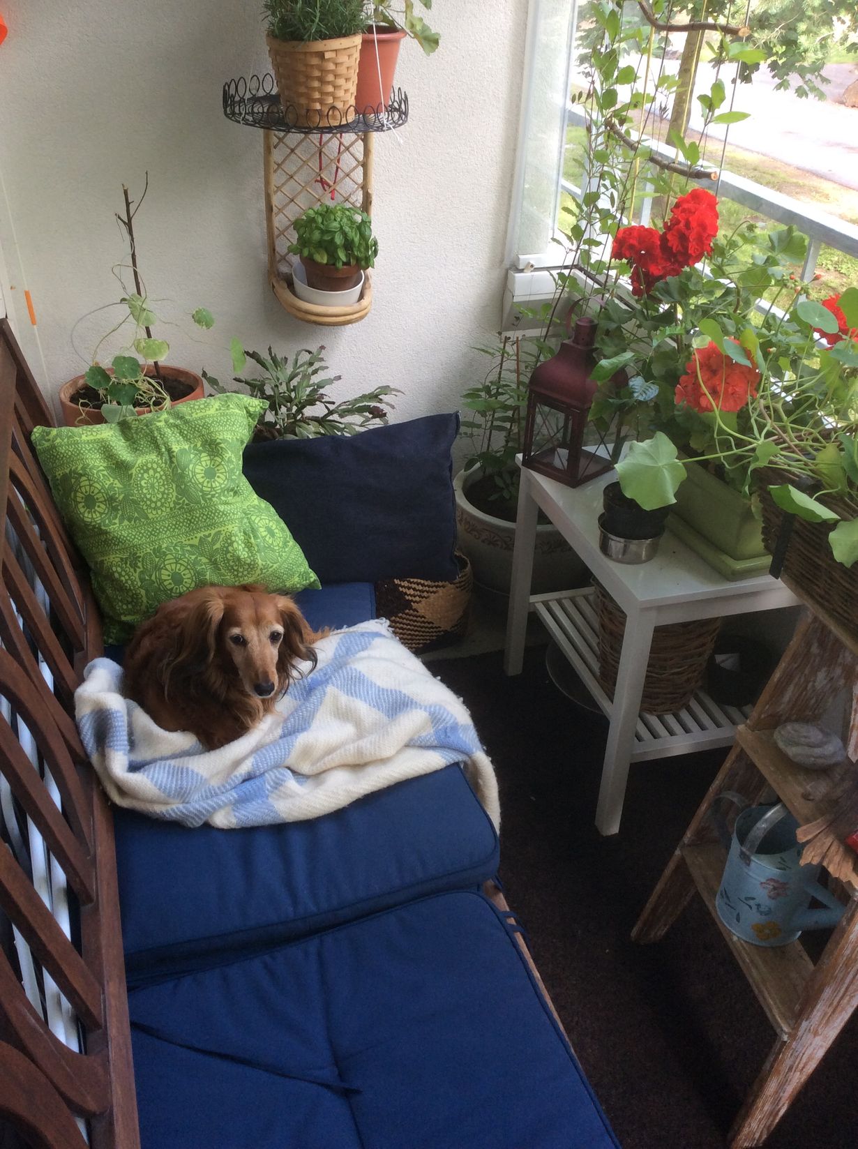 Täällä itse kasvattamieni kukkien ja Hipsu-koiran seurassa on ihanaa rentoutua, katsella pilvien vaeltelua taivaalla ja ottaa välillä makoisat päikkärit.
