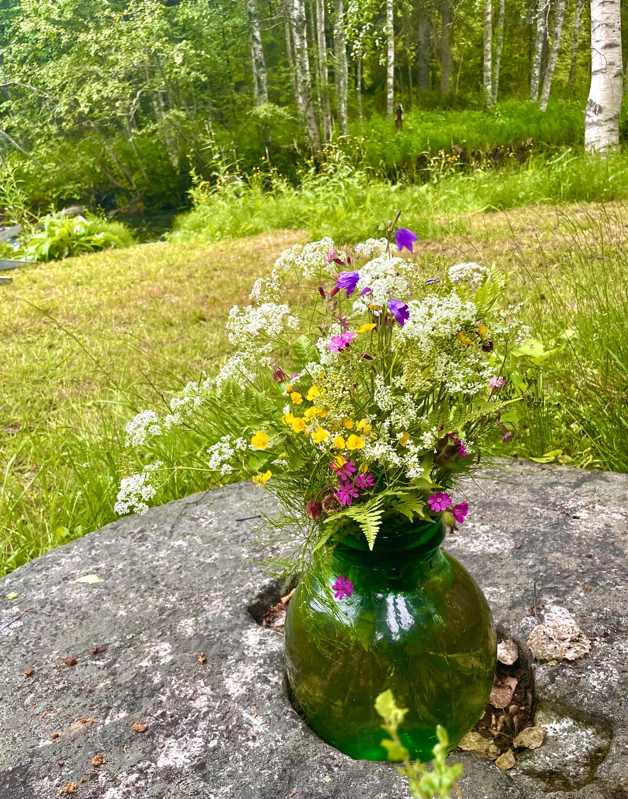 Sadehan tietää onnea! 23.8.1975 oli sekin tällainen sateinen päivä. Mökkimme kosken rannan myllynkivipöydällä oli rivi kuohuviinilaseja ja iso luonnonkukkakimppu. Olin paljasvarvasmorsian pitkässä, valkeassa puuvillamekossani; löytö silloisesta kotikaupungistamme Barcelonasta, syrjäisen kadun pienestä putiikista. Mekko oli matkannut rinkassani Marokon ja Gibraltarin kautta pohjoiseen, päätyen päälleni Kainuun mökillämme, Varisjoen varressa. Myöhemmin mekko matkasi vielä valtameren yli, Kaliforniaan, farkkusulhoni kotikaupunkiin. - Myllynkivi on nyt maassa ja rakas mieheni, Roope maan alla jo kohta 11 vuotta. - Mökillä, jota hän rakasti yli kaiken minulla on aina surumielinen olo. Häissämme Enkko-setäni esitti Rosvo-Roopen uusilla sanoilla . . . ”Hän Sirpan eessä nöyrtyi ja joutui naimisiin . . . ja jossain jokivarressa hän on nyt saunavahtina . . . ” - Muistelin noita aikoja tätä kimppua kerätessäni.