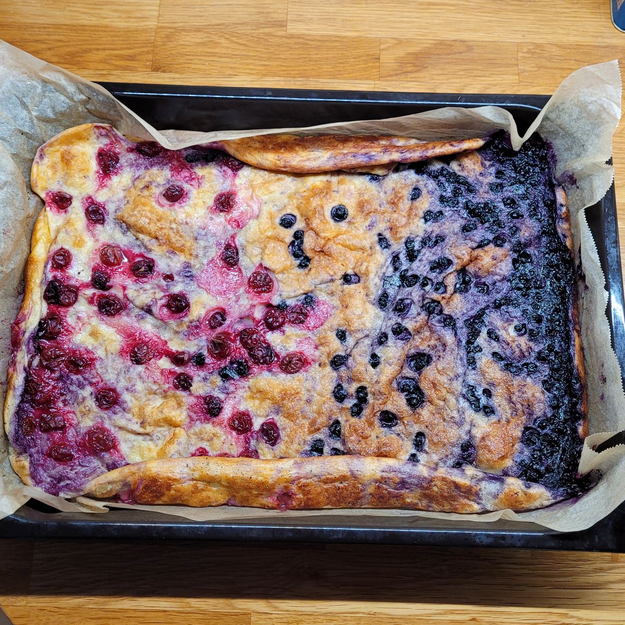 Pakkaspäivän iloksi ajattelin tehdä marjapannukakun. Pakastimesta löytyi karviaisia ja mustikoita. Lopputulos ei näytä reseptin mukaiselta. Marjat ajautuivat sinne tänne ja varsinkin reunoille. Mutta hyvältä maistui ainakin vaniljajäätelön kanssa.