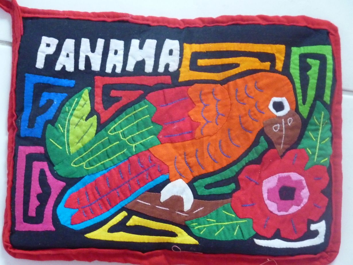 Pyrimme aina hankkimaan matkamuistoiksi mahdollisimman käyttökelpoisia esineitä, jotka kuvastavat matkakohdetta hyvin.Tämä pannunalunen pareineen on hankittu Panamasta ja palvelee tätä tarkoitusta erinomaisesti. Tekniikka on Kuno-intiaanien perinteinen mola-käsityömuoto, jossa kankaita asetellaan päällekäin, kuviot leikataan esiin ja ommellaan kiinni.